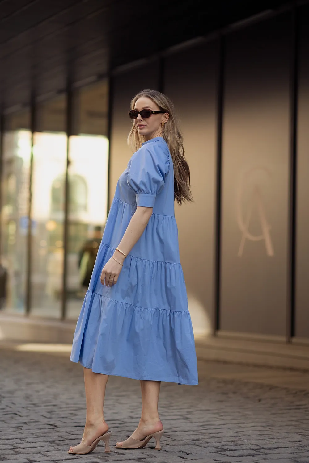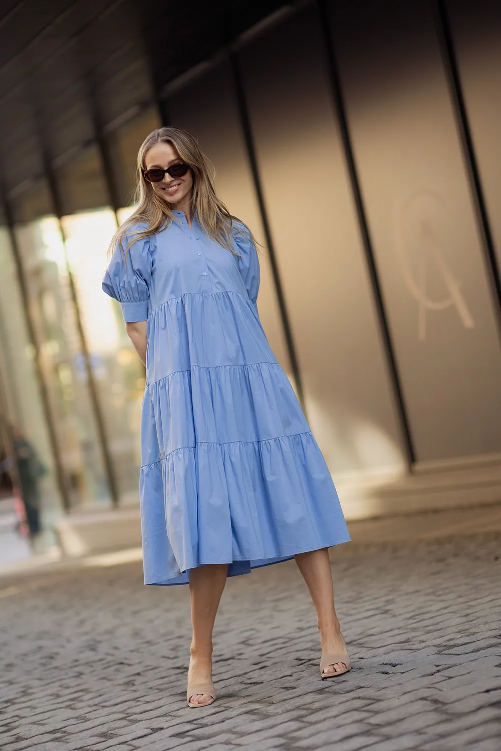 Adore Kjole Blå er den perfekte blå hverdagskjolen med en feminin og tidløs silhuett. Kjolen har korte puffermer med mansjett og en elegant kinakrage med knepping ned mot livet, som gir et klassisk og stilrent uttrykk.
