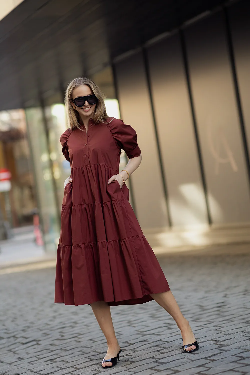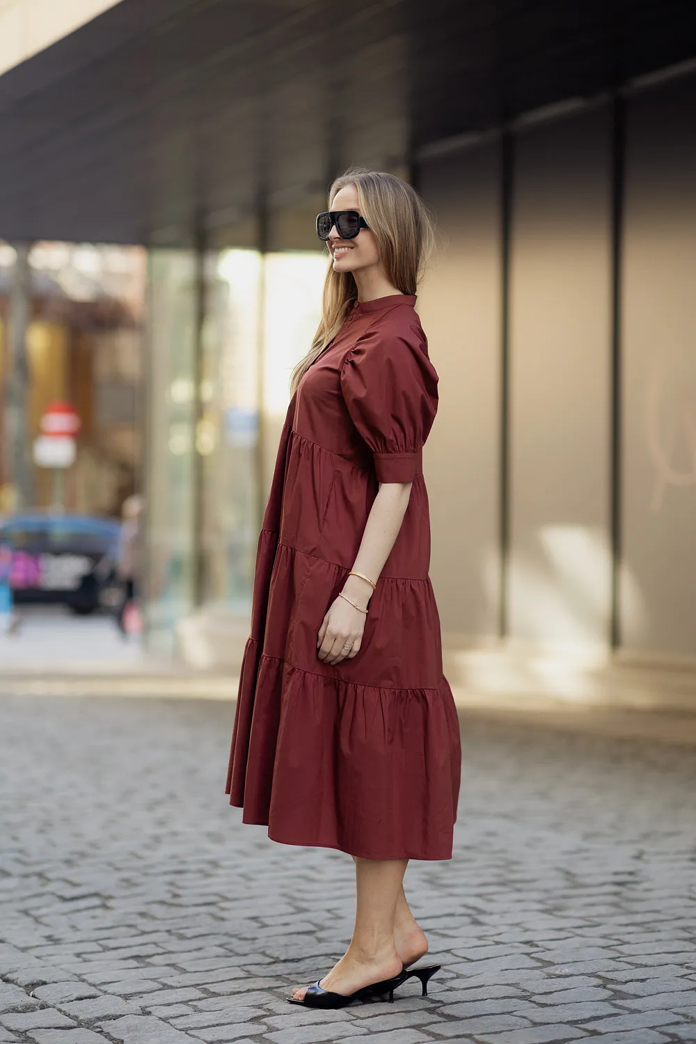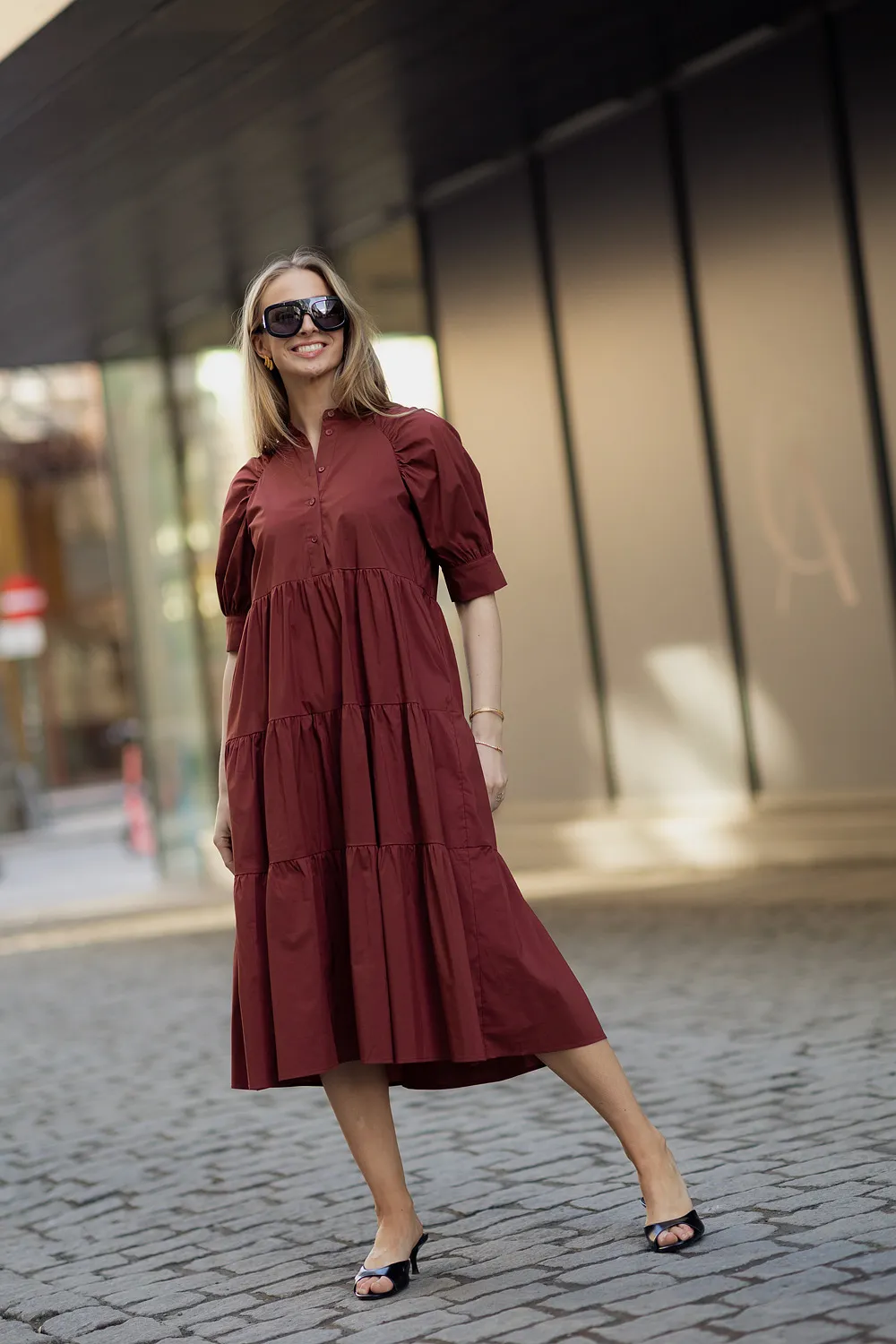 Kjolen har korte puffermer med mansjett som gir et elegant og moderne uttrykk. Den delikate kinakragen med knepping ned mot livet skaper en sofistikert detalj, mens det semihøye livet og skjørtet med kapper gir et fint fall og en flatterende silhuett. Den ledige fasongen gjør kjolen behagelig å ha på, og praktiske stikklommer i sidene gir både komfort og funksjonalitet.