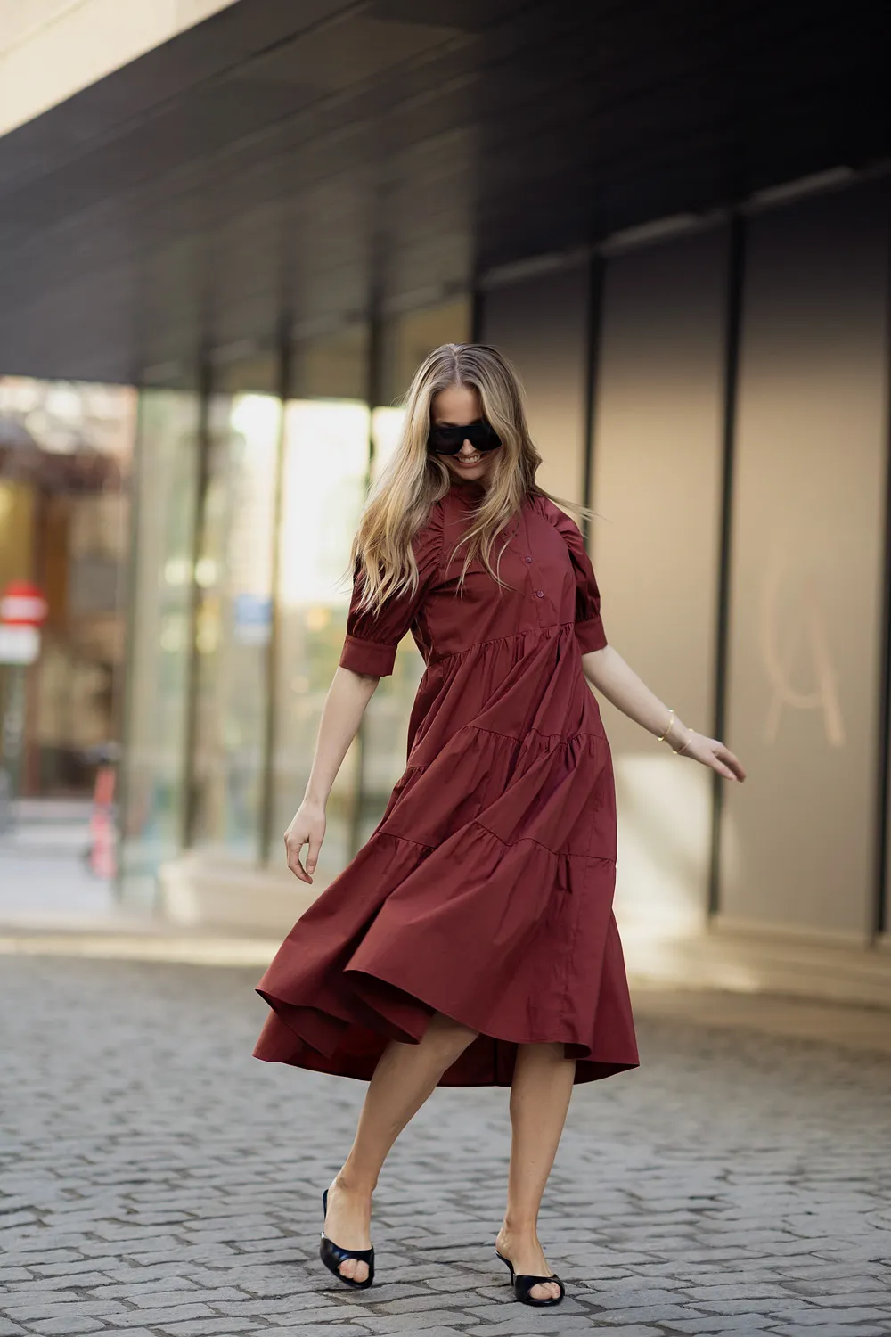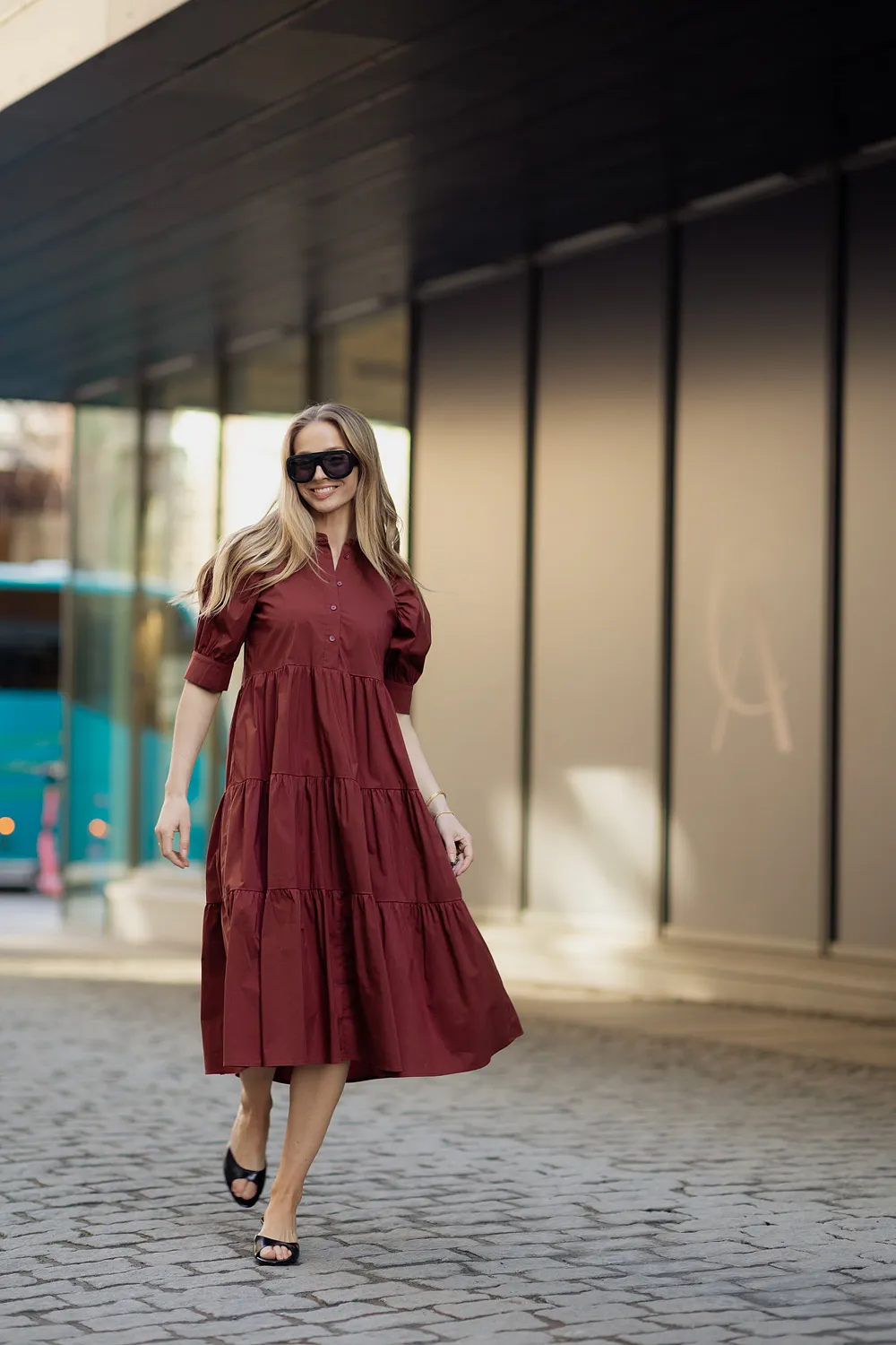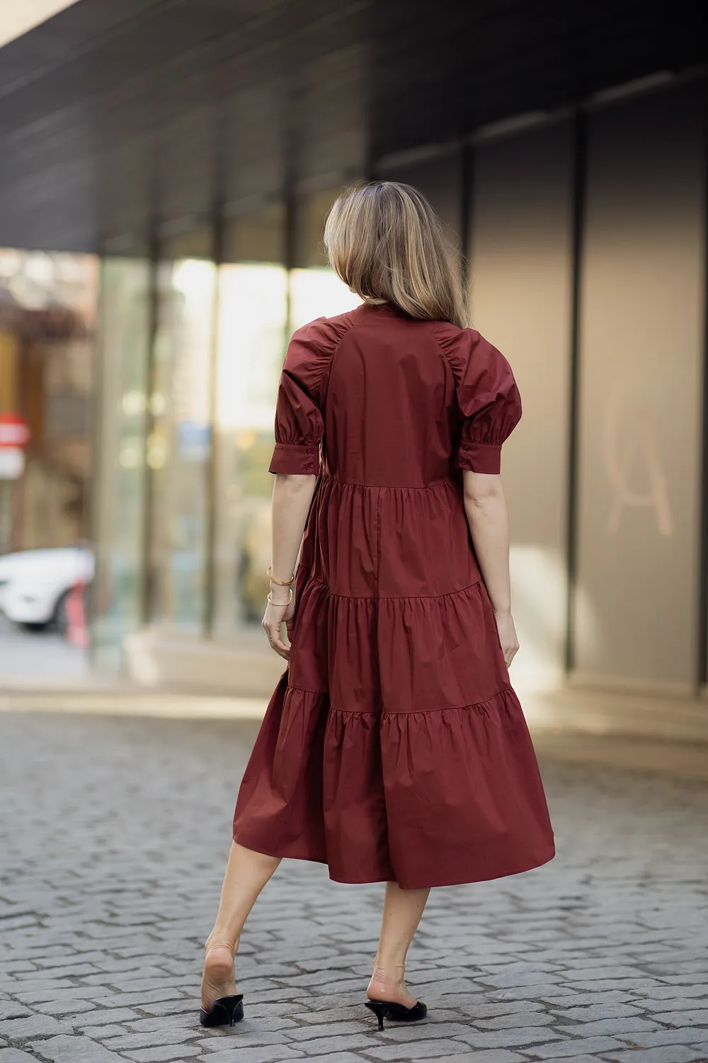 Kjolen har korte puffermer med mansjett som gir et elegant og moderne uttrykk. Den delikate kinakragen med knepping ned mot livet skaper en sofistikert detalj, mens det semihøye livet og skjørtet med kapper gir et fint fall og en flatterende silhuett. Den ledige fasongen gjør kjolen behagelig å ha på, og praktiske stikklommer i sidene gir både komfort og funksjonalitet.
