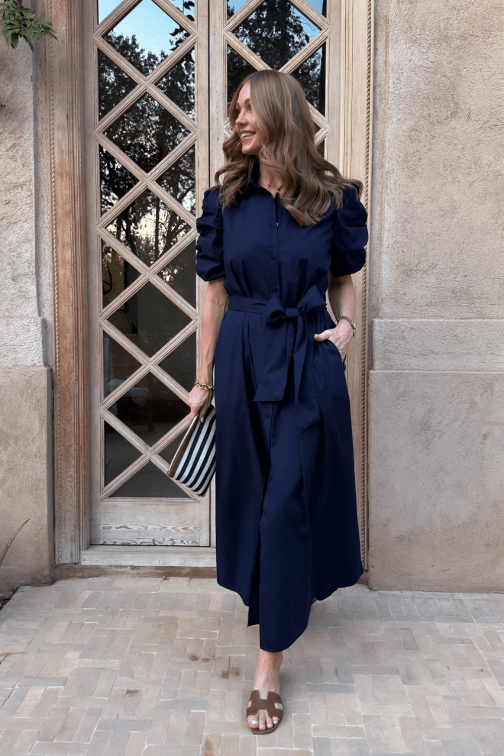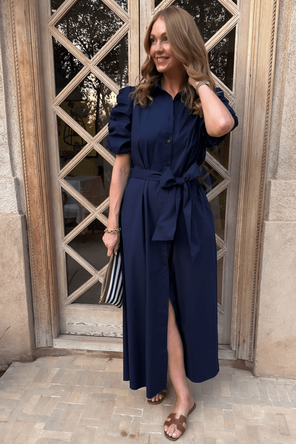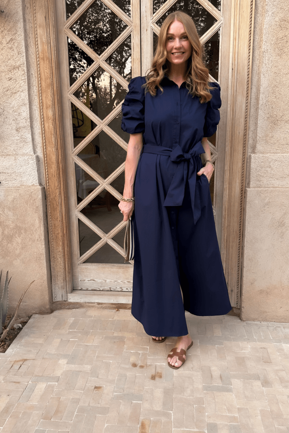 Kjolen har krage og knepping hele veien ned, som gir et sofistikert og stilrent uttrykk. De korte puffermeene med dekorative rynkebånd tilfører en feminin detalj, mens det brede beltet i livet fremhever midjen og skaper en flatterende silhuett. Praktiske stikklommer i sidene gjør kjolen både komfortabel og funksjonell.