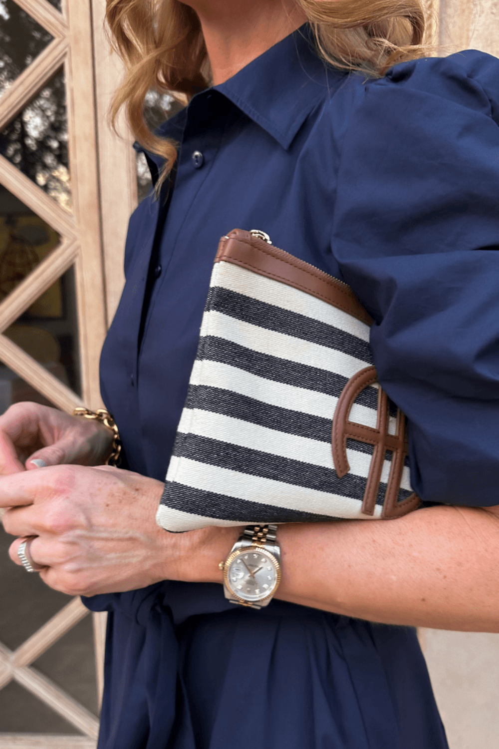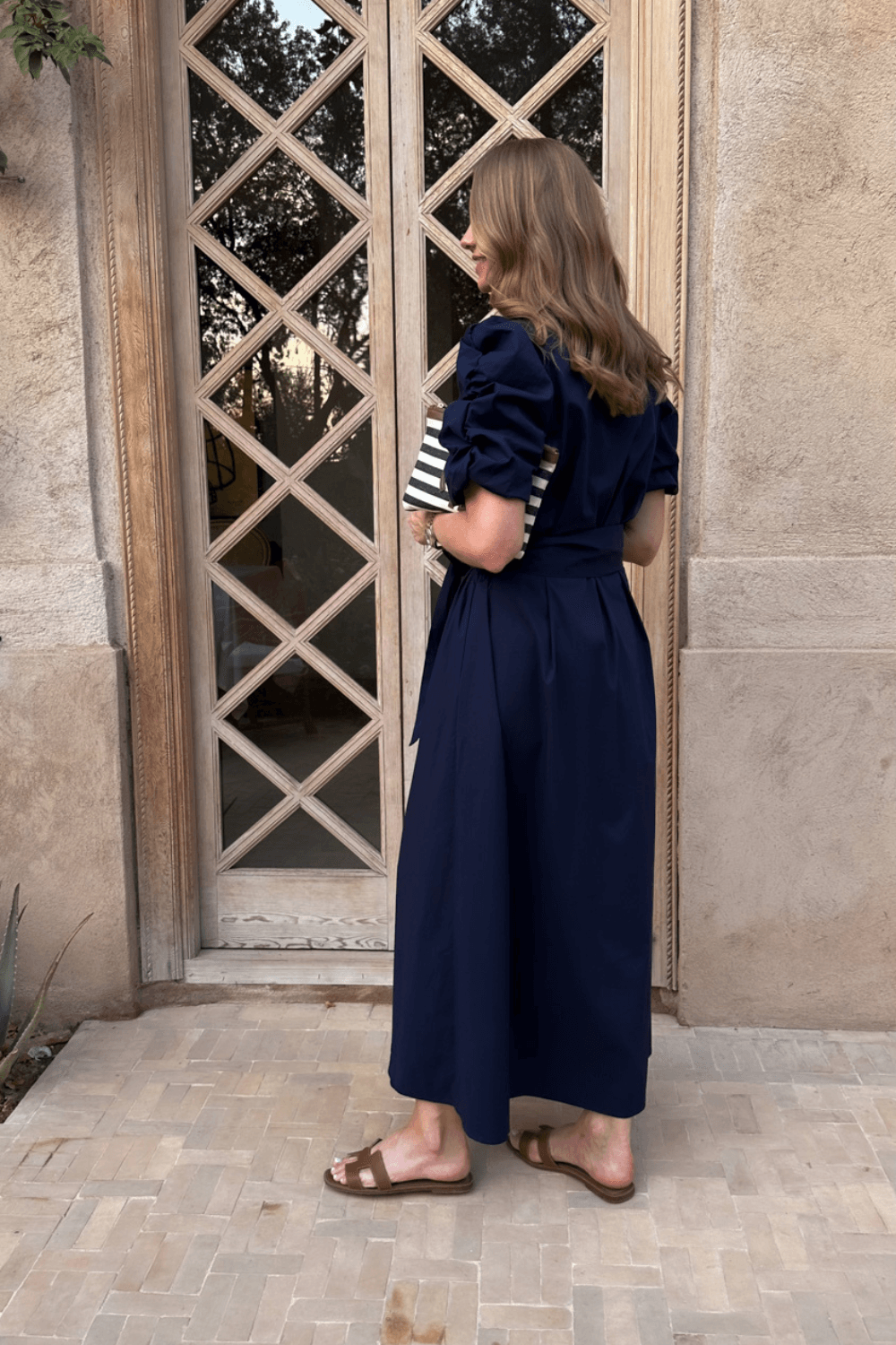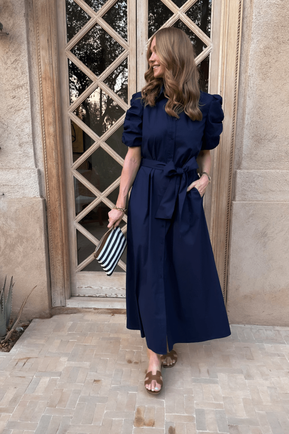 Kjolen har krage og knepping hele veien ned, som gir et sofistikert og stilrent uttrykk. De korte puffermeene med dekorative rynkebånd tilfører en feminin detalj, mens det brede beltet i livet fremhever midjen og skaper en flatterende silhuett. Praktiske stikklommer i sidene gjør kjolen både komfortabel og funksjonell.