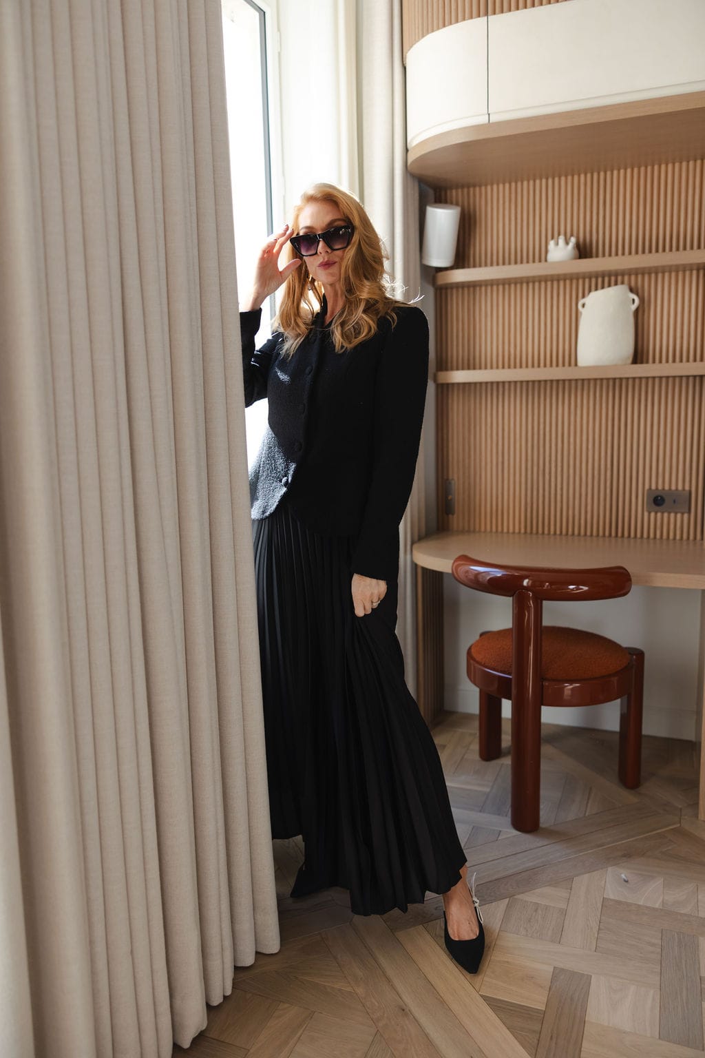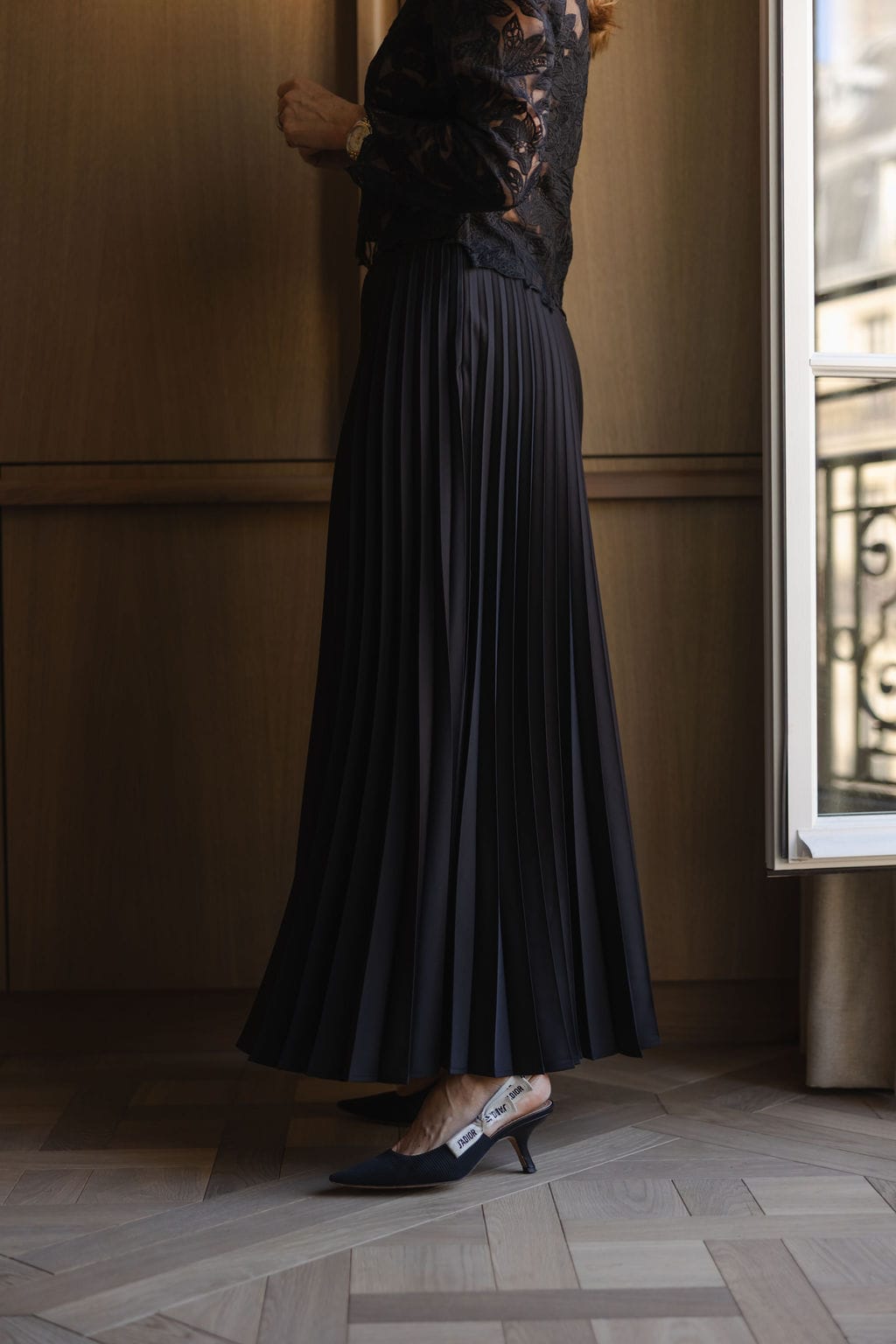Amelie skjørt sort er et lekkert, plissert skjørt i en klassisk sort farge med en lett, shiny overflate. Skjørtet har glidelås i livet og hel lengde, som gir et elegant og tidløst uttrykk.