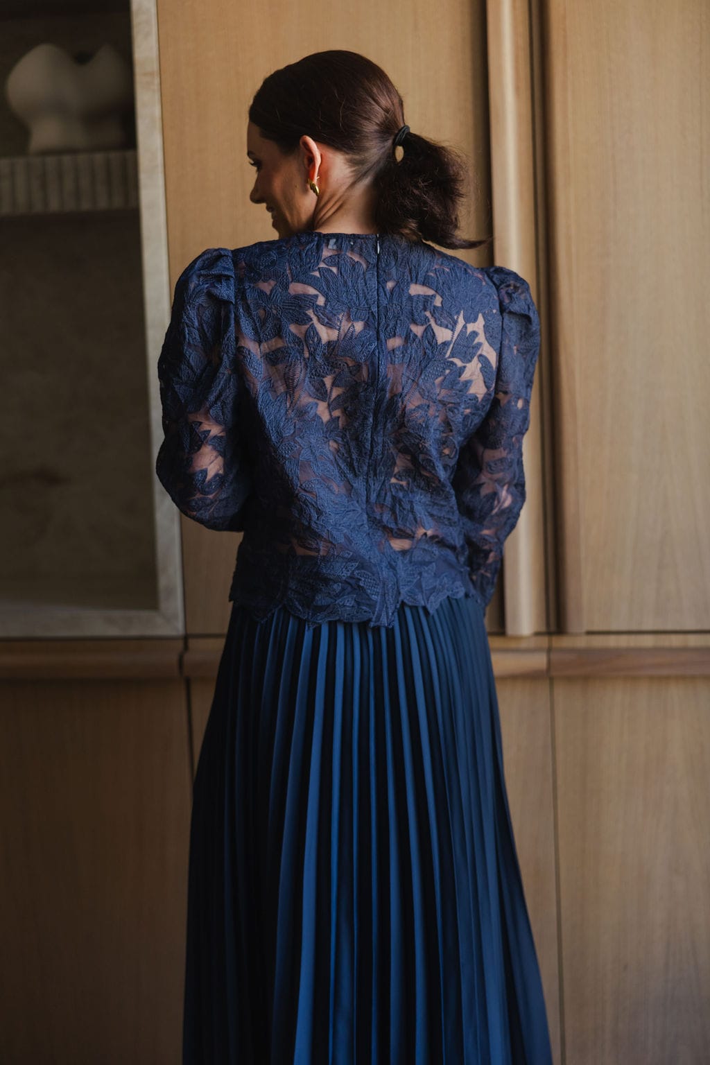 Beauty bluse navy er en lekker bluse med blomstrete hullbroderier og transparent meshkvalitet bak. Rund hals og lange ermer med feminin puffeffekt i skuldrene. Lukkes med skjult glidelås i ryggen og knapp i nakken. Innsvinget, kort fasong. Blusen er helt normal på størrelsen.