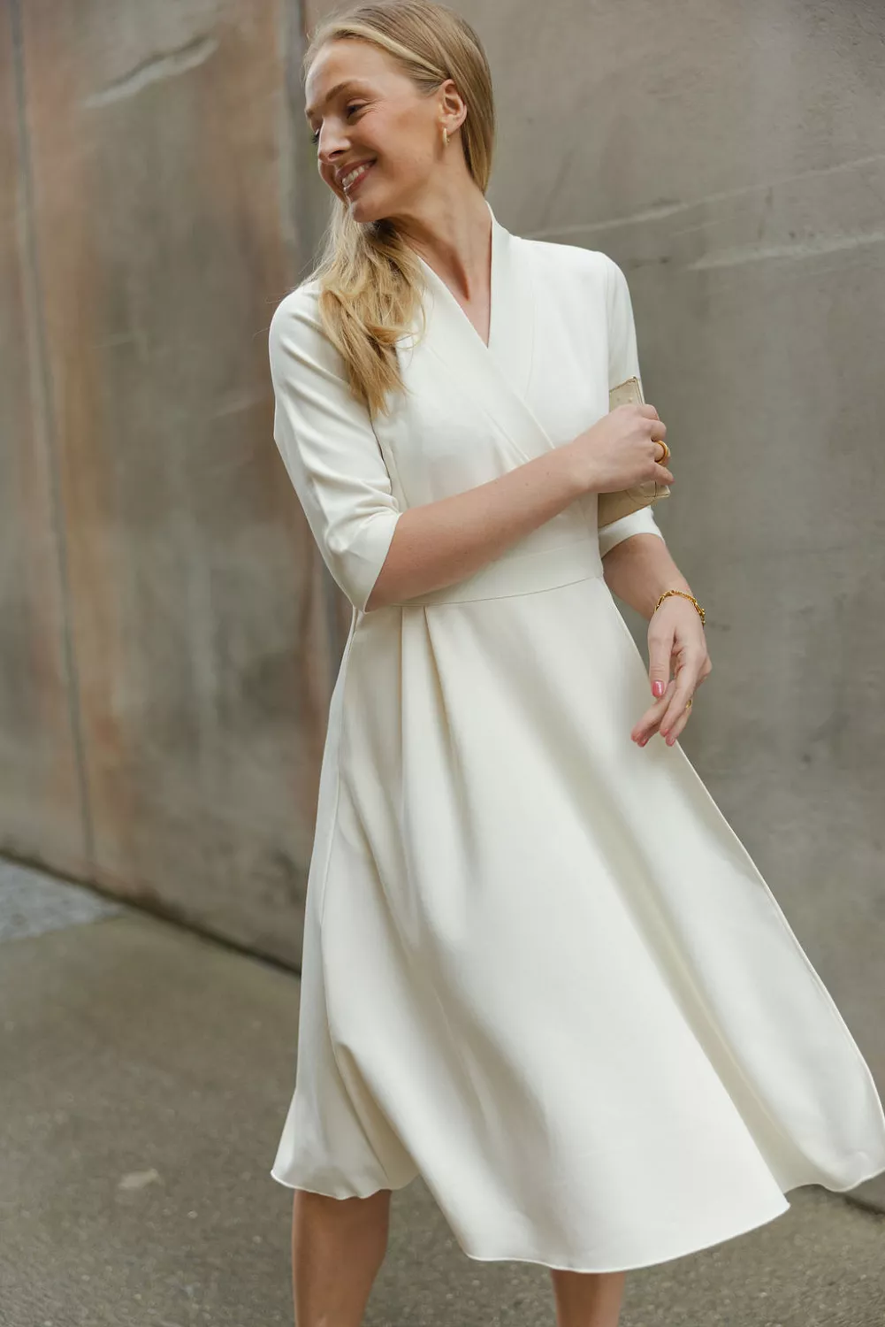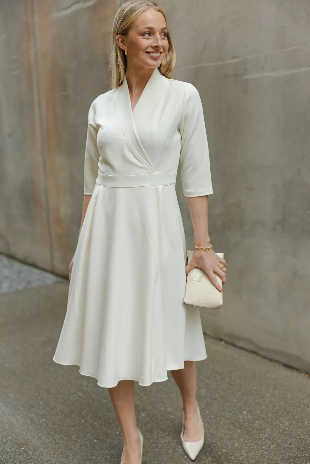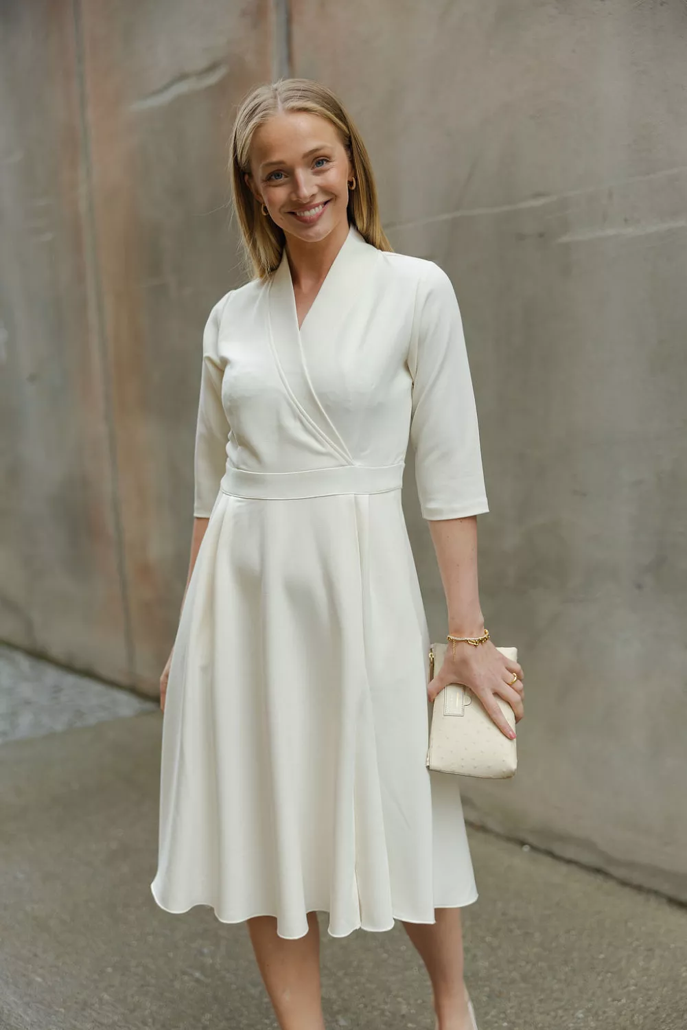 Bertine Kjole Creme er en elegant og deilig omslagskjole. Kjolen kommer i tungt og stødig stoff som faller perfekt. V-utringing og fastsydd midjebånd gir en flatterende silhuett. Skjørt med utsving og lommer i sidene. Lukkes med glidelås i siden. Hvis du vipper mellom 2 størrelser så anbefaler vi at du går ned 1 størrelse.