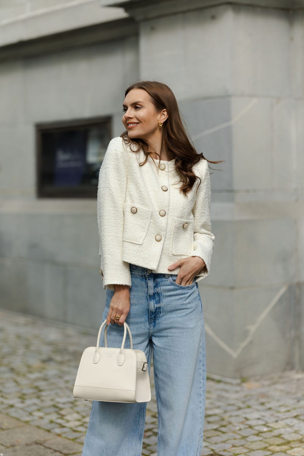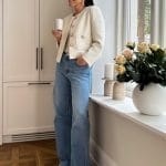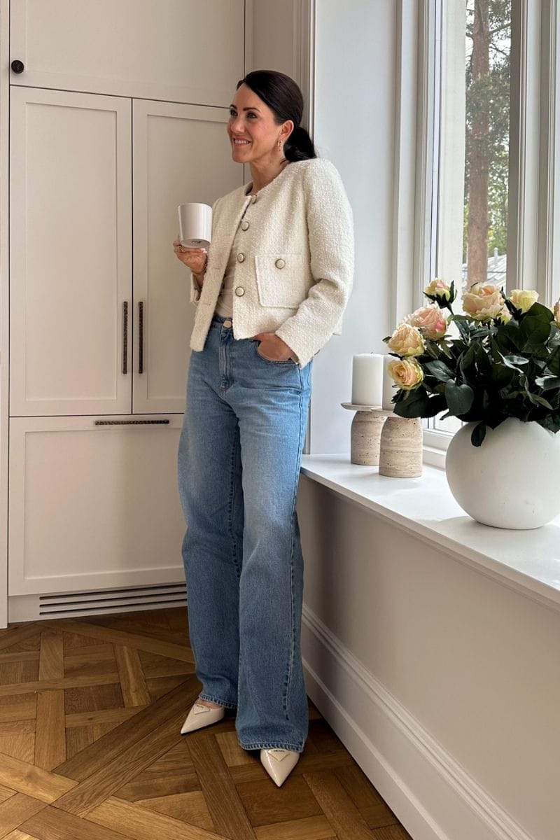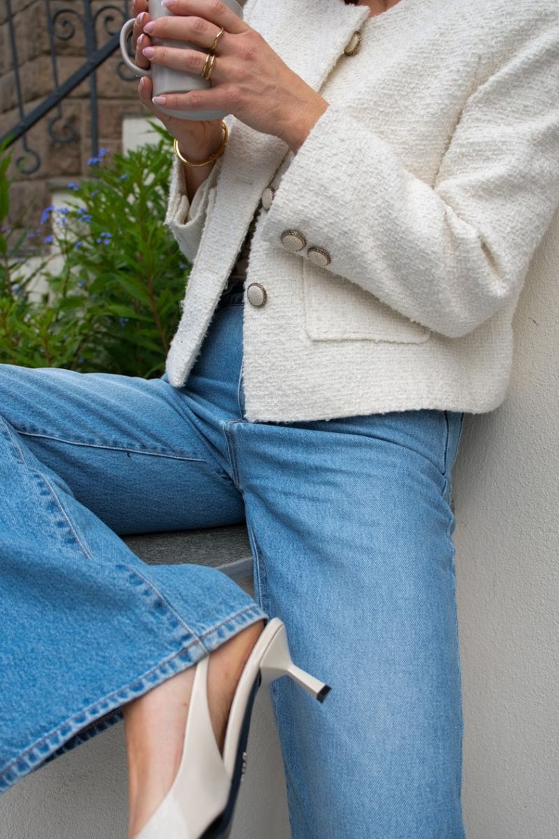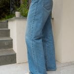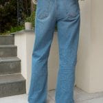 Jeansen har høyt liv som smigrer midjen og gir en feminin silhuett, samtidig som de vide, rette bena skaper en moderne og uanstrengt passform. Den sitter flatterende over hofter og bak, før den faller rett ned – noe som gir både komfort og en trendy edge.