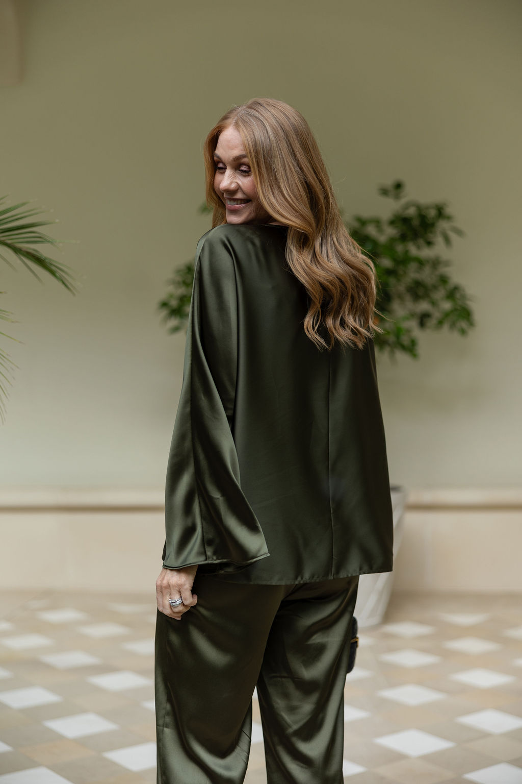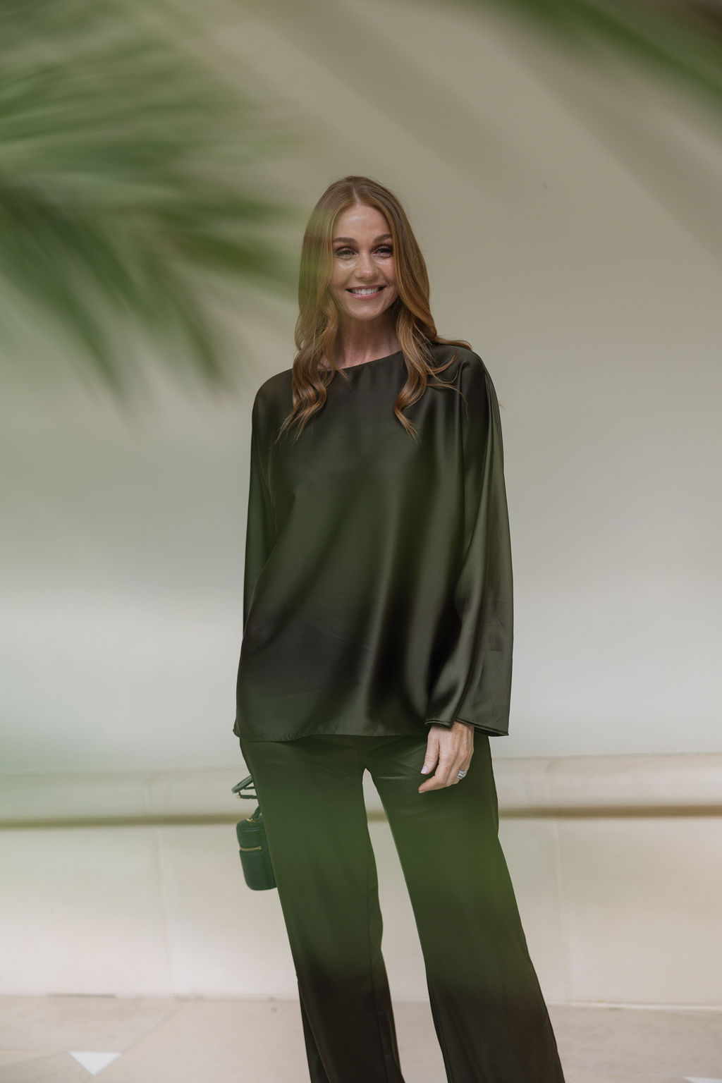 Blusen har rund hals og lange, vide ermer som tilfører en moderne og feminin silhuett. Den glatte kvaliteten gir en lett og luksuriøs følelse, perfekt både til hverdagsbruk og mer pyntede anledninger.