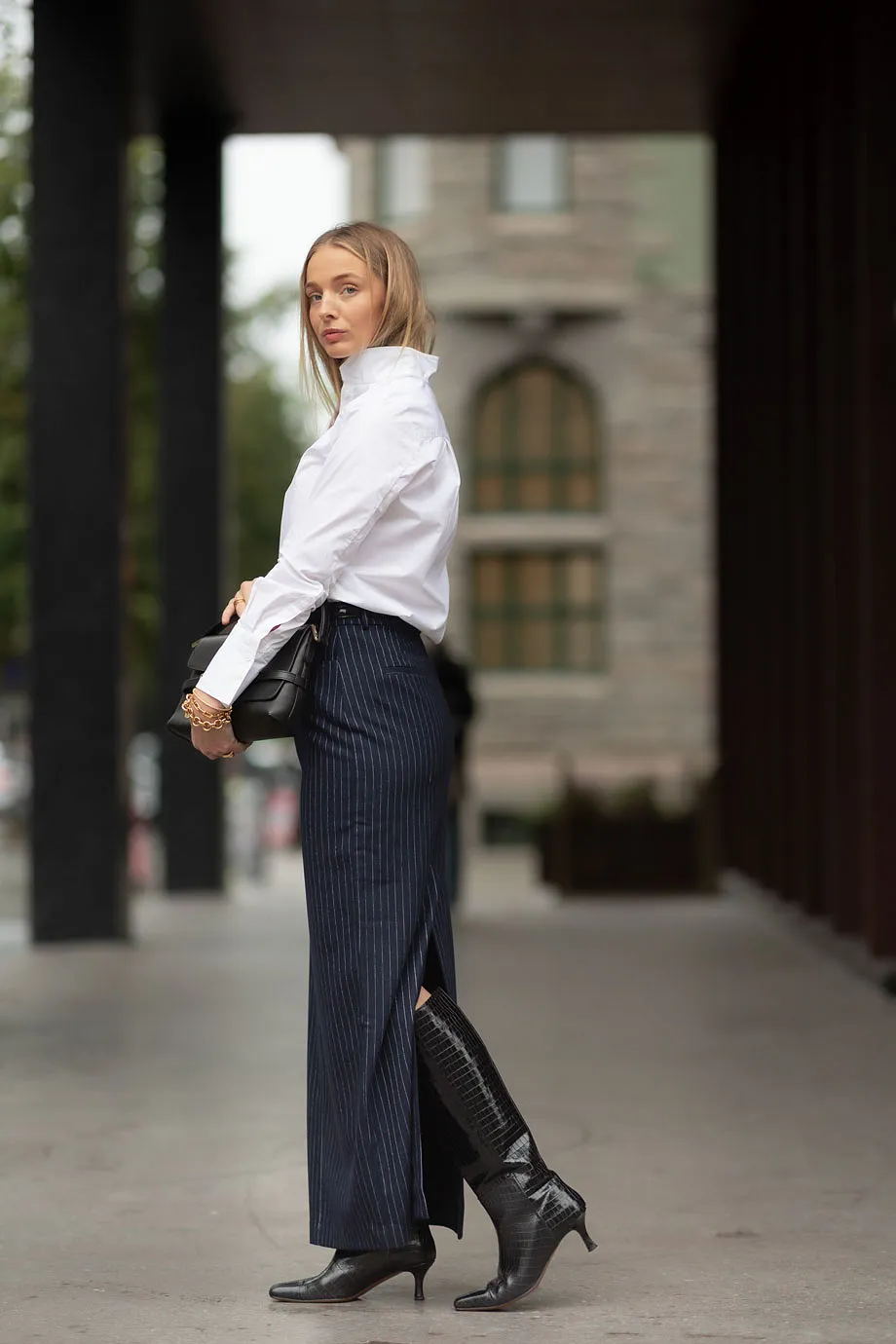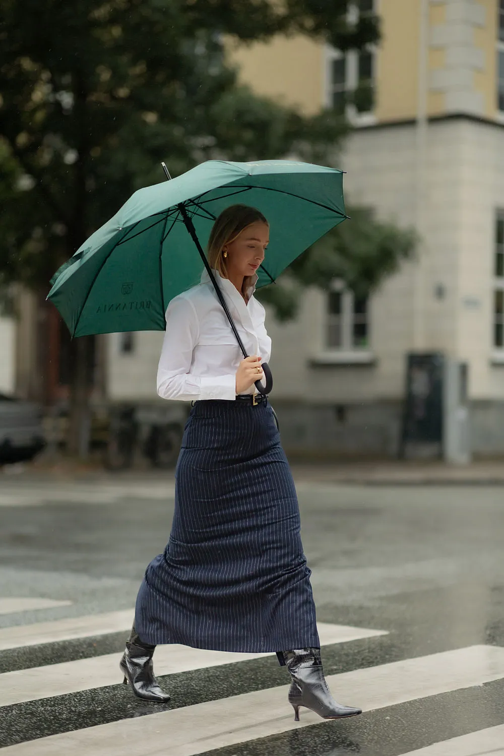 Den rette silhuetten gir et moderne uttrykk, mens den lange lengden og diskré splitt bak tilfører både eleganse og bevegelsesfrihet. Skjørtet har praktiske sidelommer, baklommer og beltehemper, samt lukking med knapp og glidelås foran for en flatterende passform og enkel bruk.