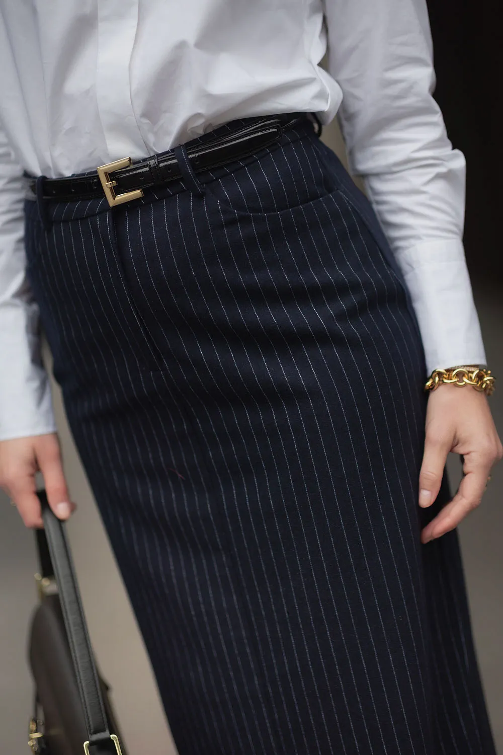 Harmony Skjørt Striper fra Hiil Studio er et elegant og klassisk maxiskjørt til dame, laget i en eksklusiv og varm ullblanding. Dette navyfargete skjørtet med striper kombinerer komfort og stil, og passer perfekt både til jobb, hverdag og formelle anledninger.