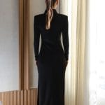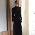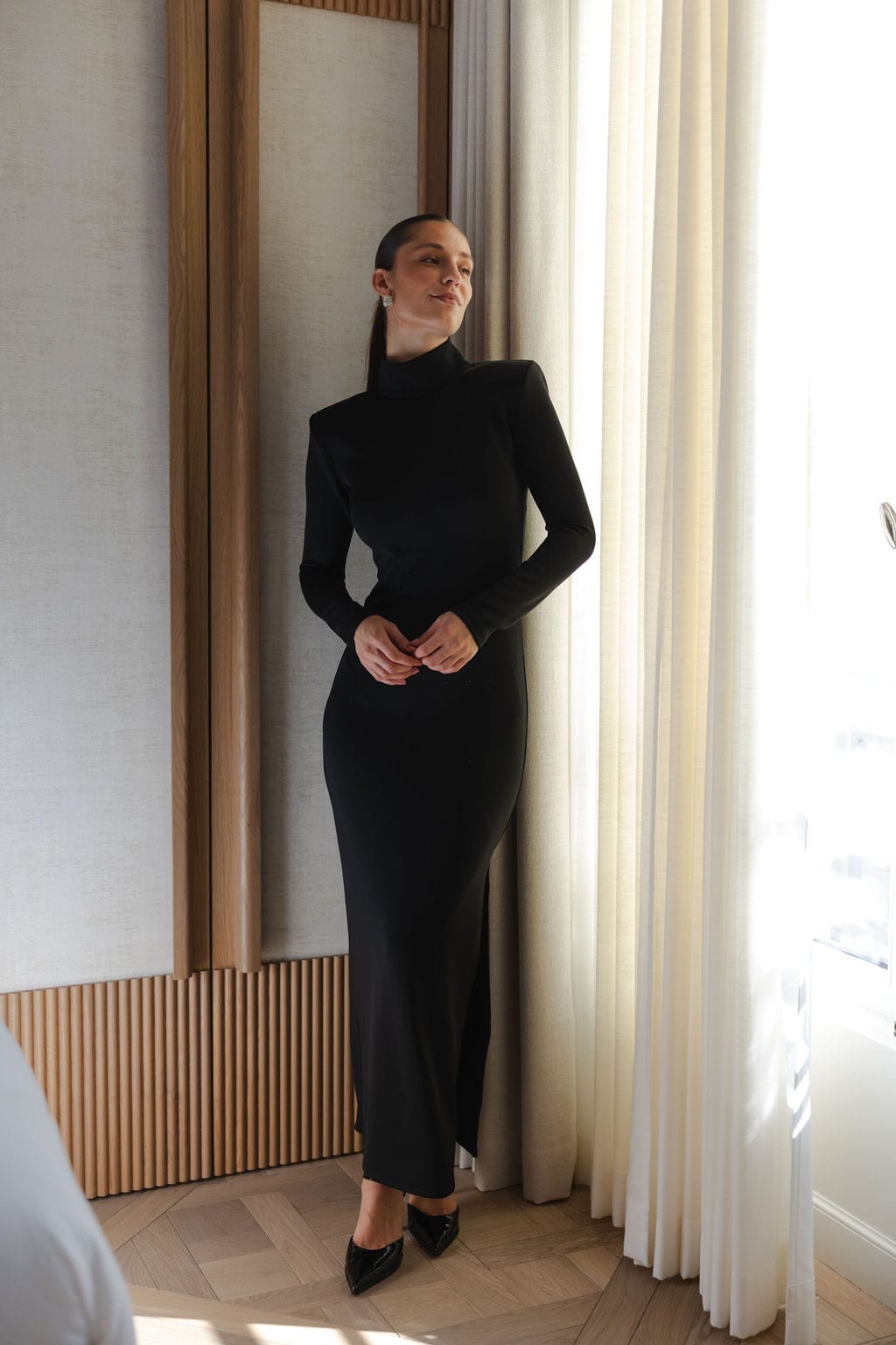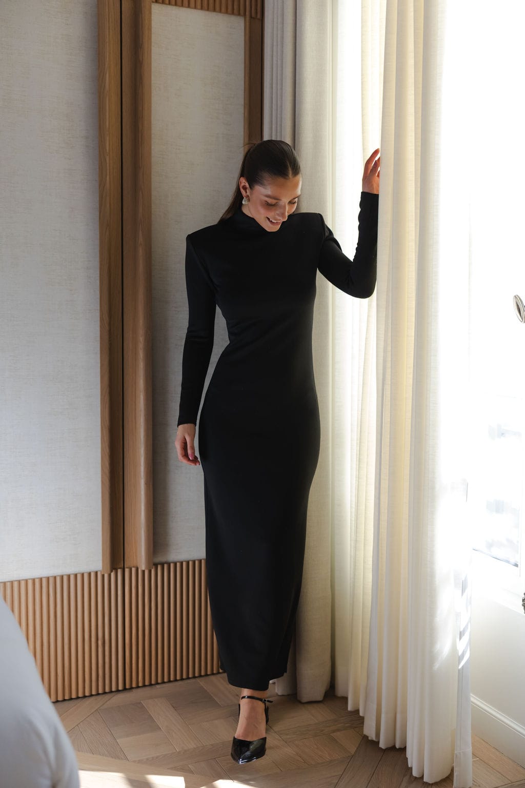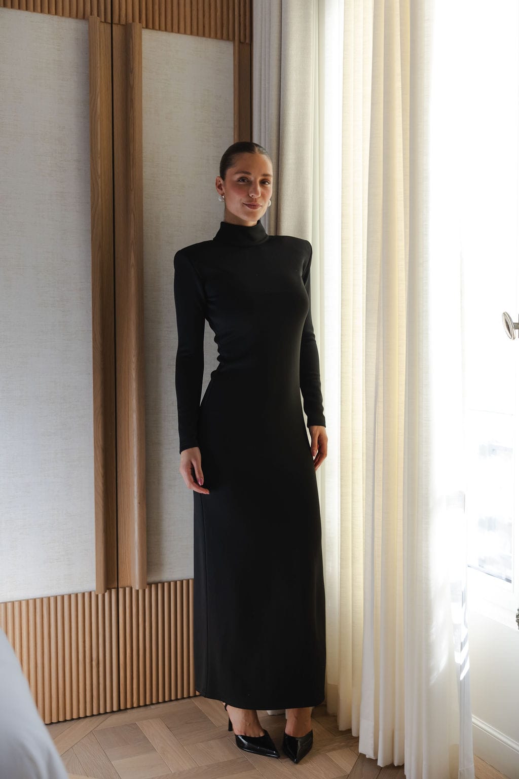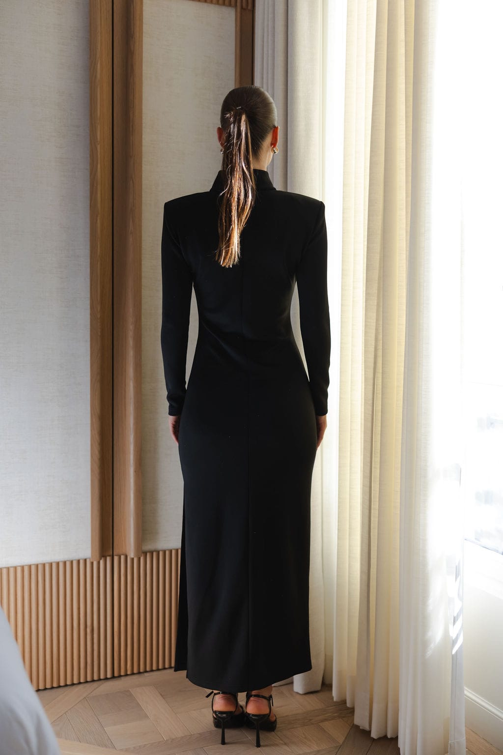 Icy Kjole Svart er en elegant og tidløs maxikjole med et moderne, sofistikert uttrykk. Kjolen har lange ermer, høy hals og avtakbare skulderputer som gir en strukturert og stilfull silhuett.