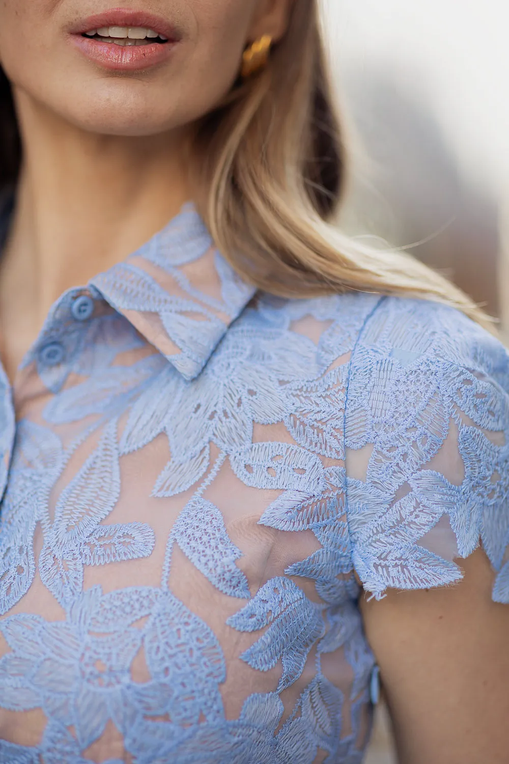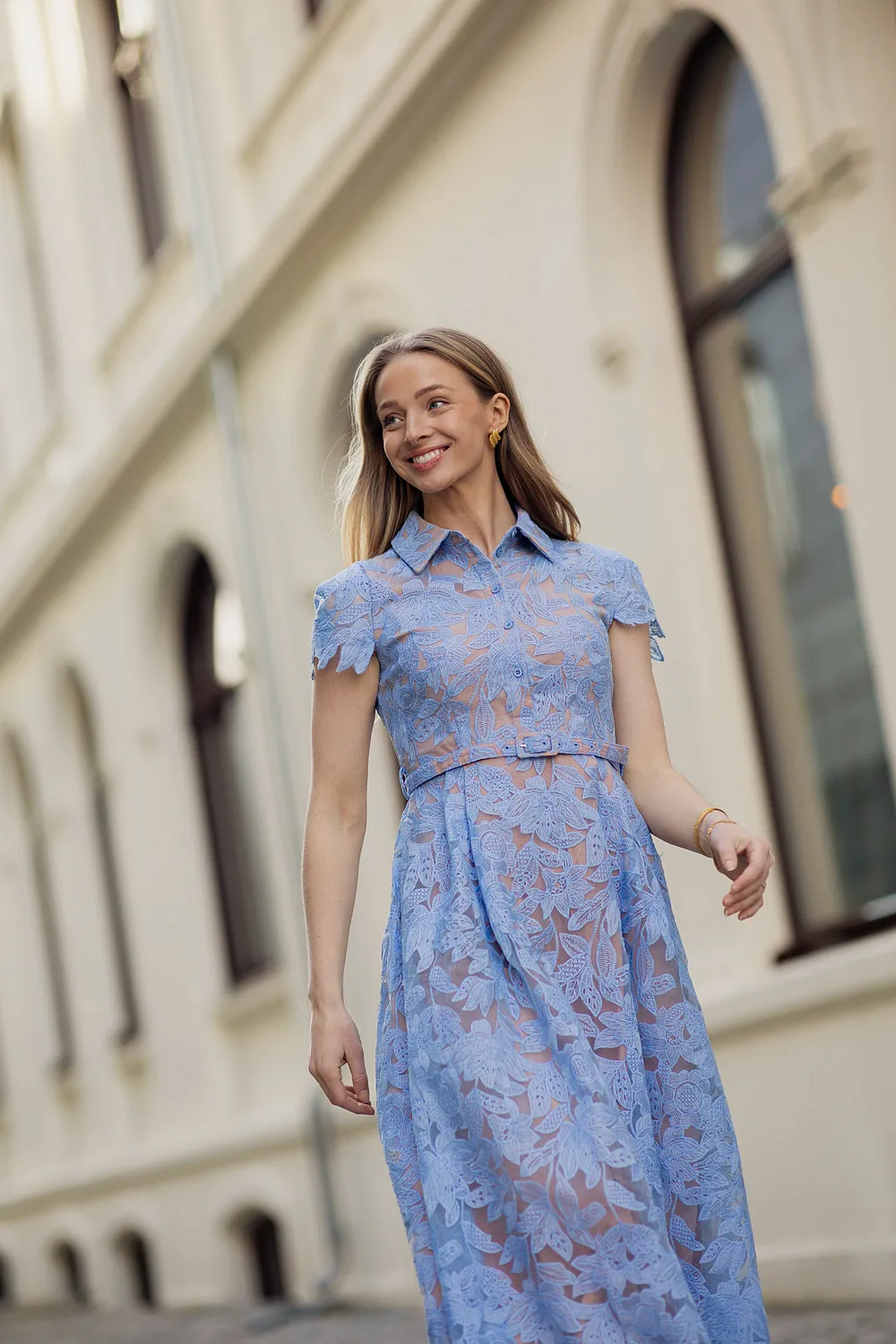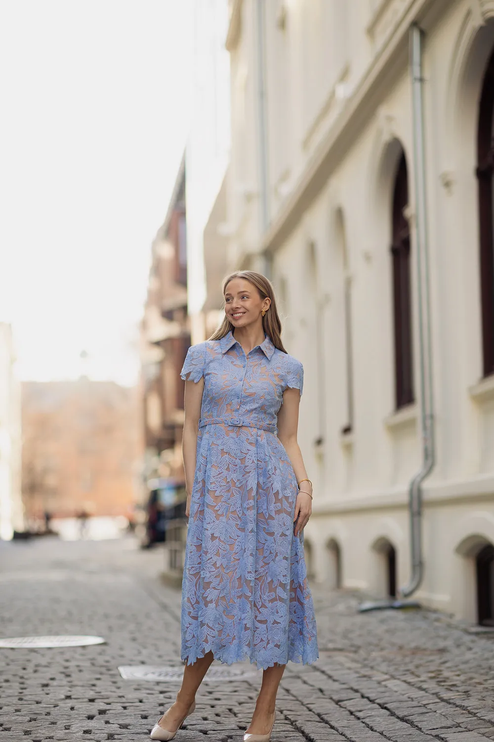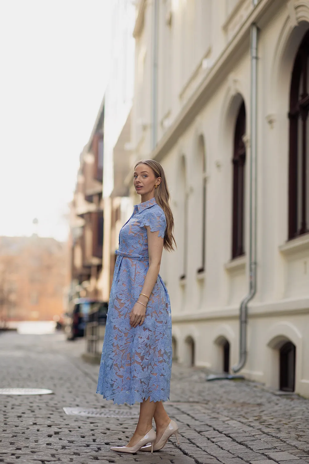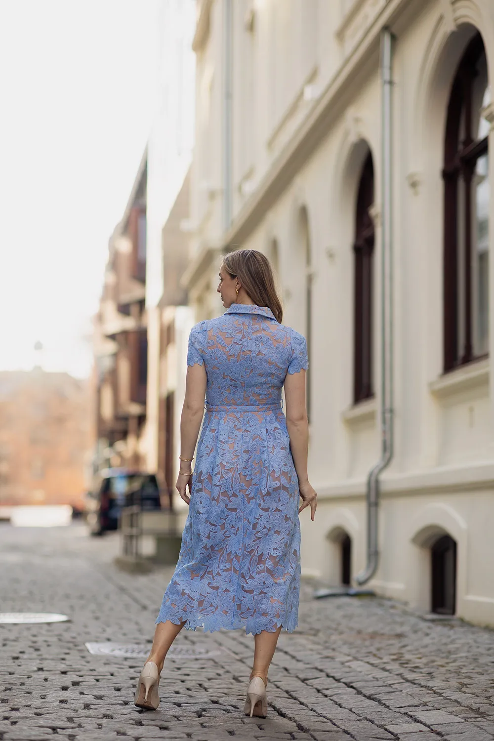 Julie Kjole Lace Blå er en nydelig kjole med et fantastisk og flatterende snitt! Julie Lace er «søsteren» til Julie Dress, men i delikat blondedesign og en kjempefin lyseblå farge. Kjolen har midi-lengde med skjortekrage og korte ermer med fine detaljer på skuldrene. Dekorative knapper og et smalt belte i livet. Stikklommer i sidene. Kjolen har fôring i nude farge da blondene er gjennomsiktige. Den perfekte festkjolen! NB! Liten i størrelsen, så vi anbefaler å gå opp en størrelse i denne.