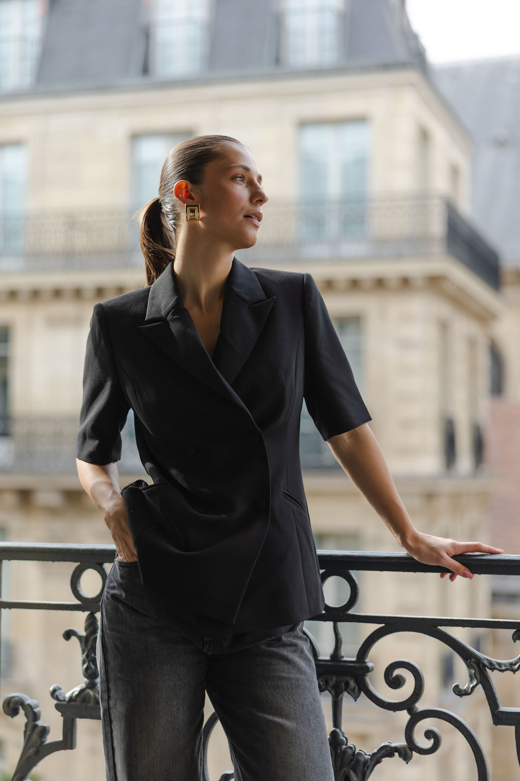 Mia Blazer SS Sort er en klassisk foret dressjakke med korte ermer i klassisk sort. Jakken er innsvinget i fasongen og er i et lett og deilig stoff som faller fint. Blazeren har slag og lukkes med fire knapper foran. Falske skrålommer foran og splitt bak. Perfekt sammen med tilhørende bukse for en full dress, men også superfin både over kjoler og jeans.
