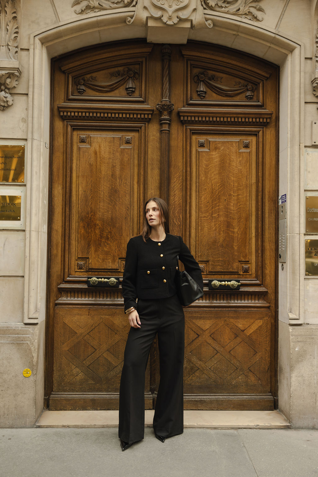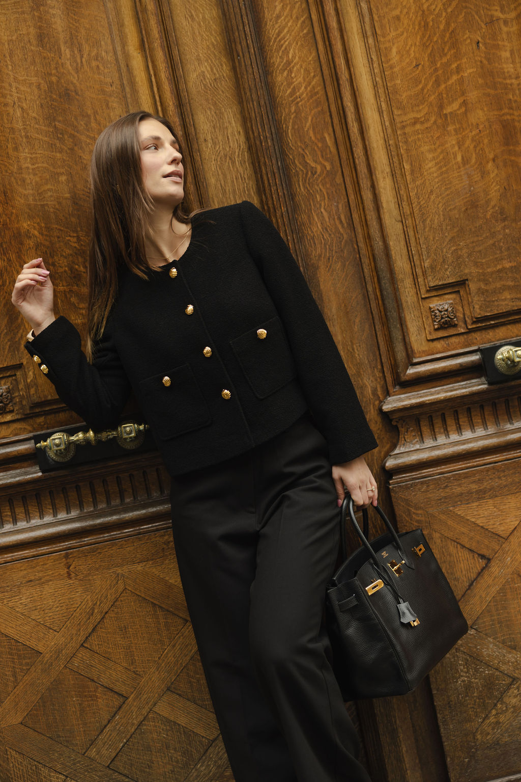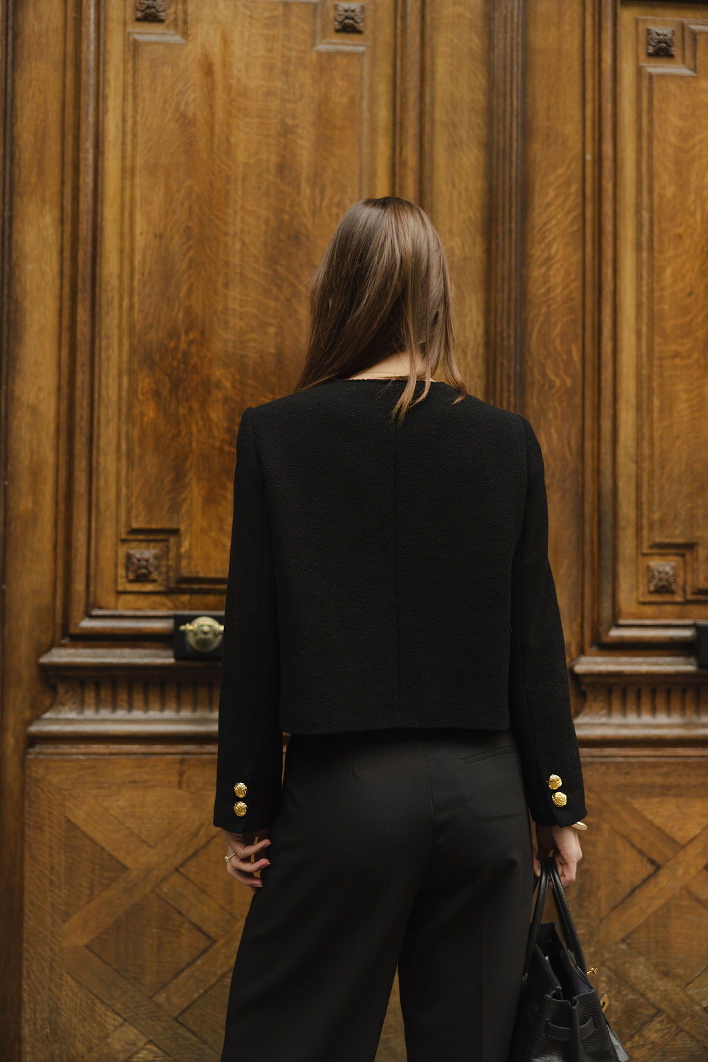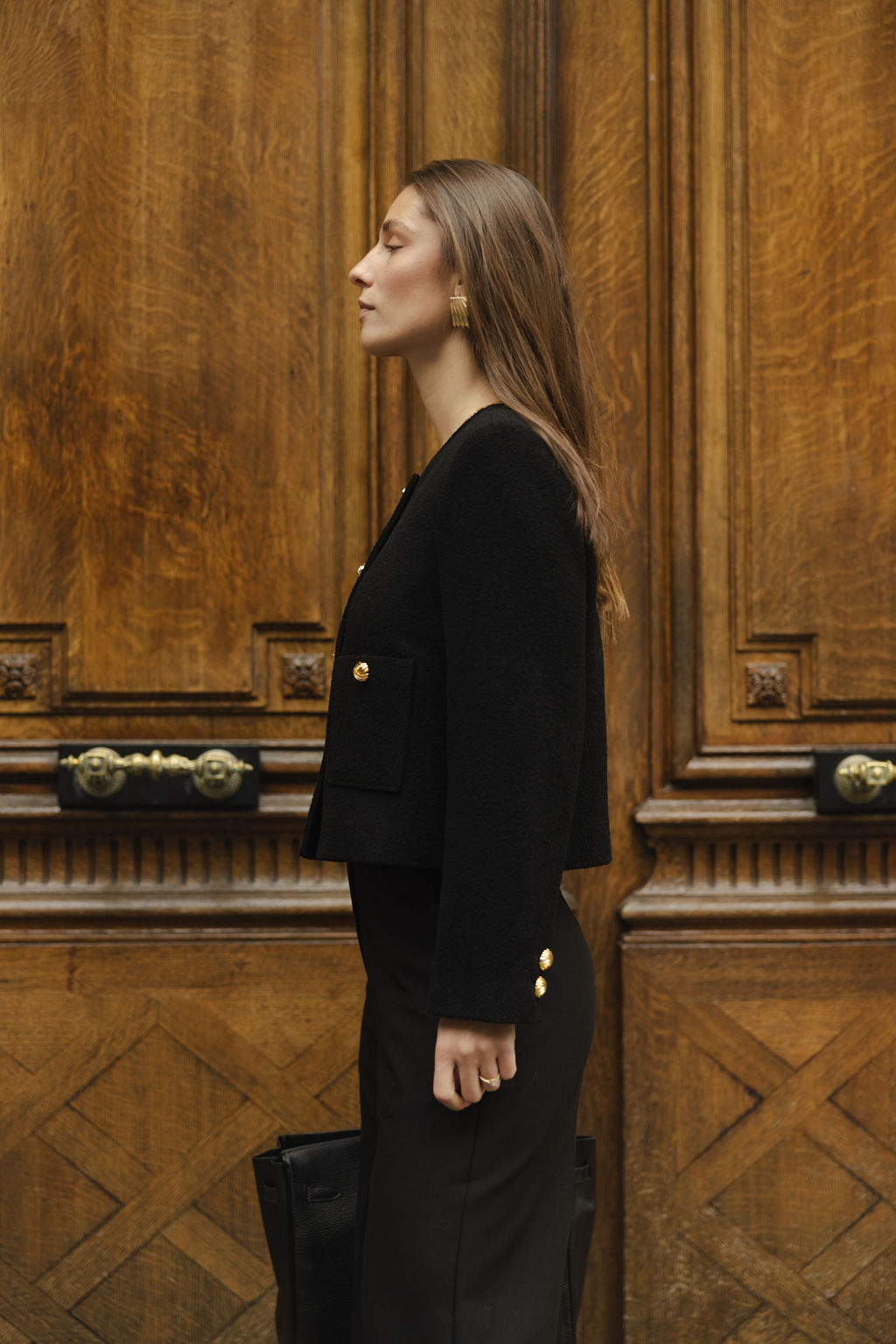 Queen Jakke Svart er en elegant og tidløs jakke i tweed-stoff. Dekorative gullfargede knapper foran og nederst på ermene. Jakken har to stikklommer i front og har en rett fasong. Et fantastisk plagg som kan pyntes opp og ned. Denne klassikeren har du sesong etter sesong! Jakken er helt normal på størrelsen.