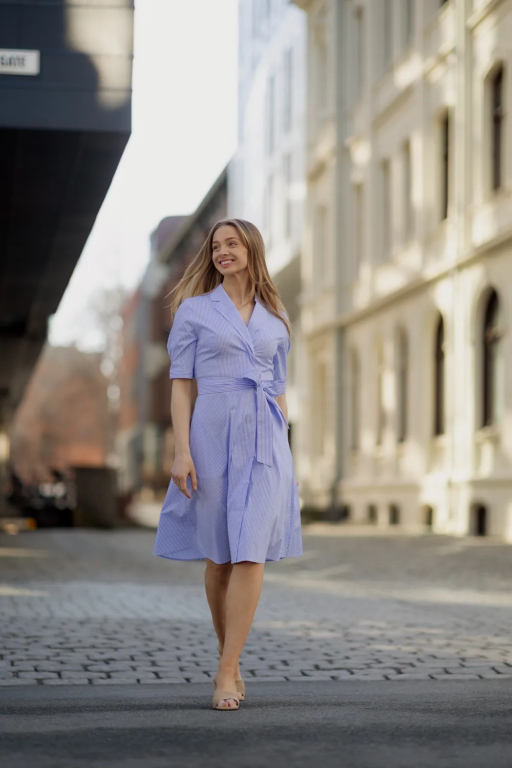 Sandie kjole striper er en elegant mørkeblå jobbkjole som kombinerer komfort, struktur og en feminin silhuett. Denne skjortekjolen med omslagspreg (wrap dress-inspirert) er designet for å være en allsidig favoritt i garderoben.