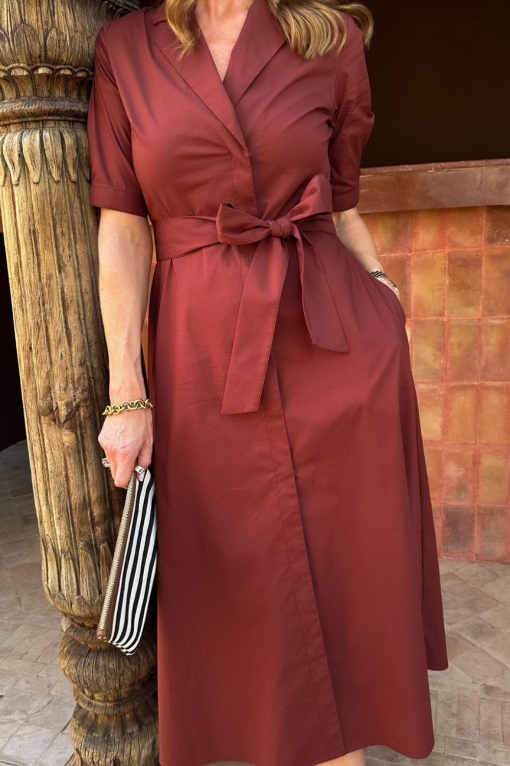 Kjolen har skjulte trykknapper i front som gir et rent og gjennomført uttrykk. Det medfølgende beltet i livet fremhever midjen og skaper en flatterende passform. Med klassisk krage, korte ermer og praktiske lommer i sidene får du en kjole som både er stilren og anvendelig.