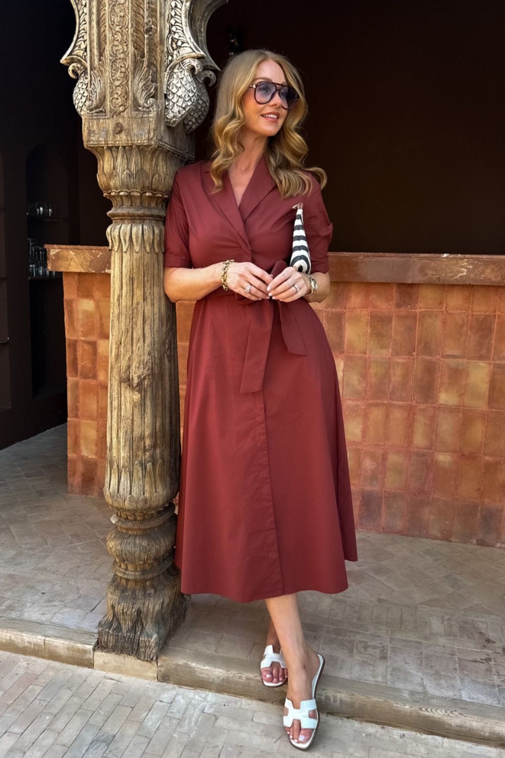 Sandie Midi kjole Cappuccino er den perfekte hverdagskjolen du bare må ha i skapet. Den har skjulte trykknapper i front som gir et rent og gjennomført uttrykk, samt et belte i livet som fremhever midjen og skaper en feminin silhuett.