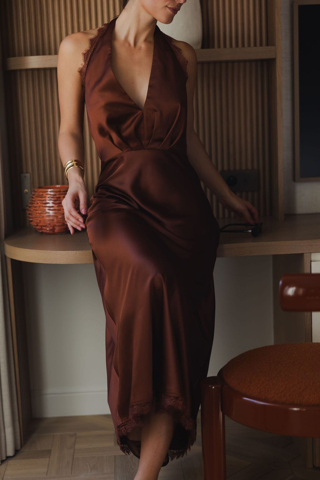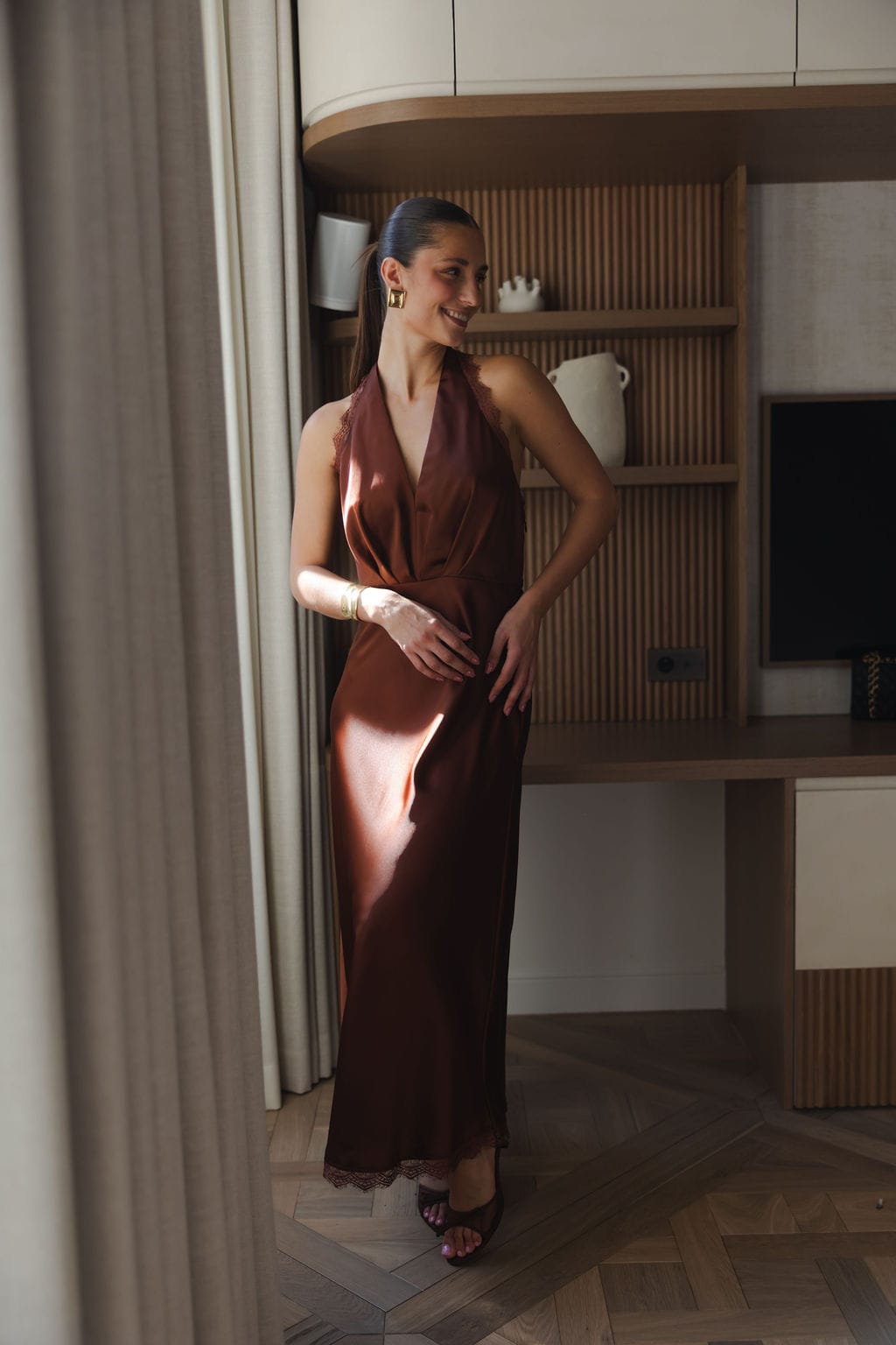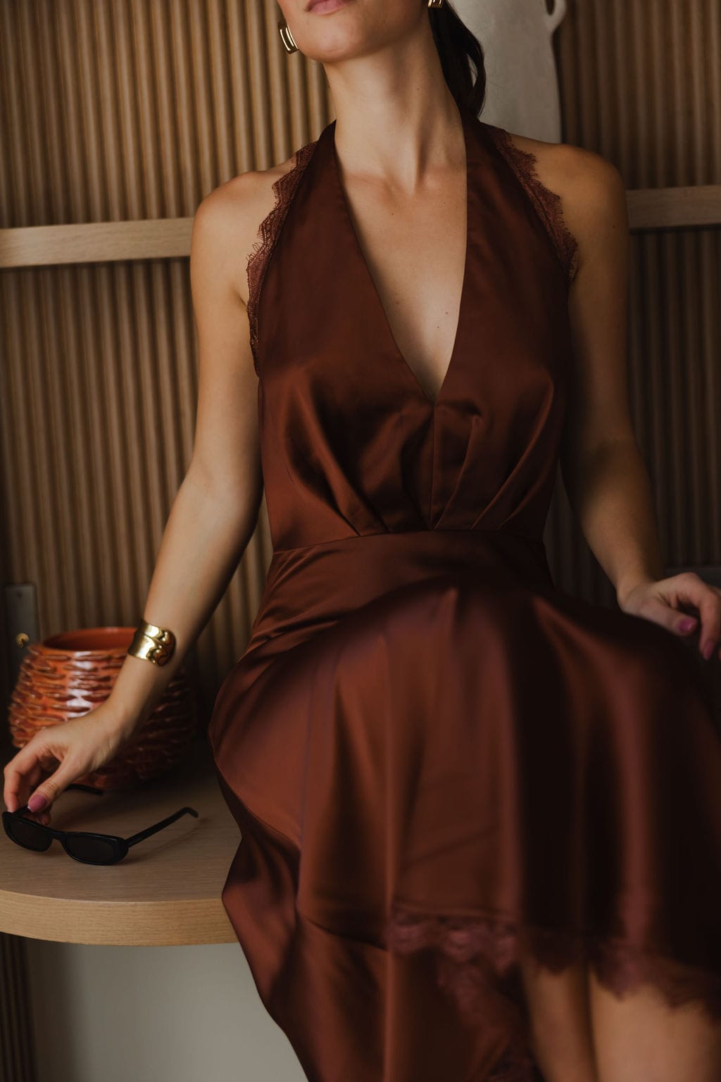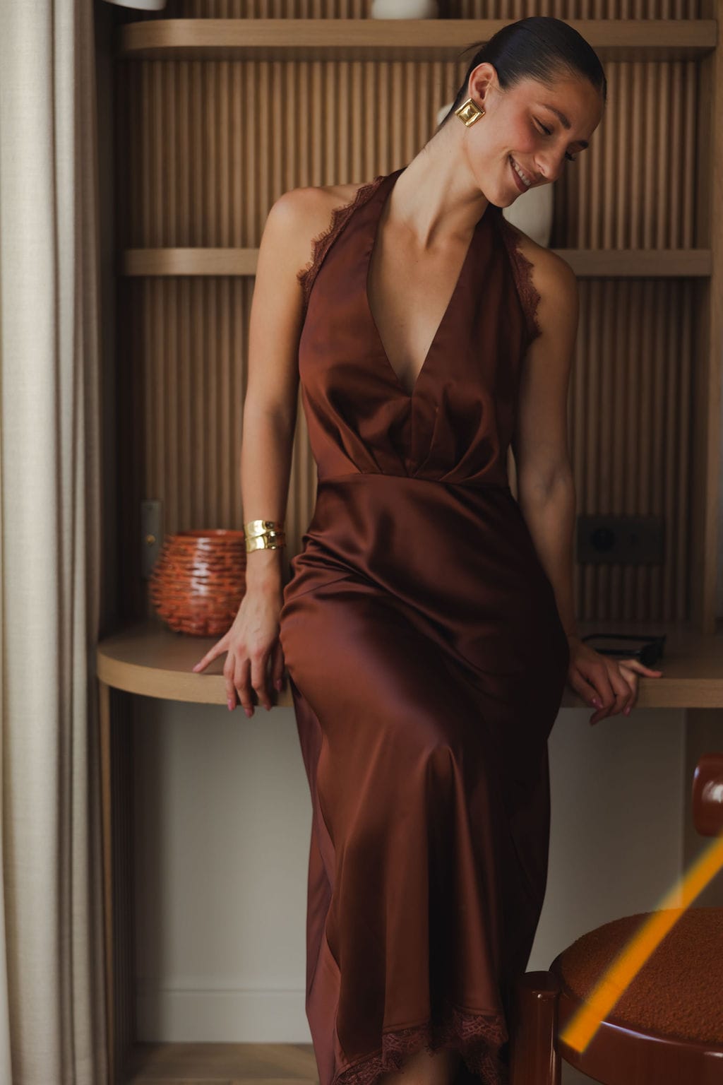 Sateen Kjole Cappuccino – Elegant satengkjole med halterneck