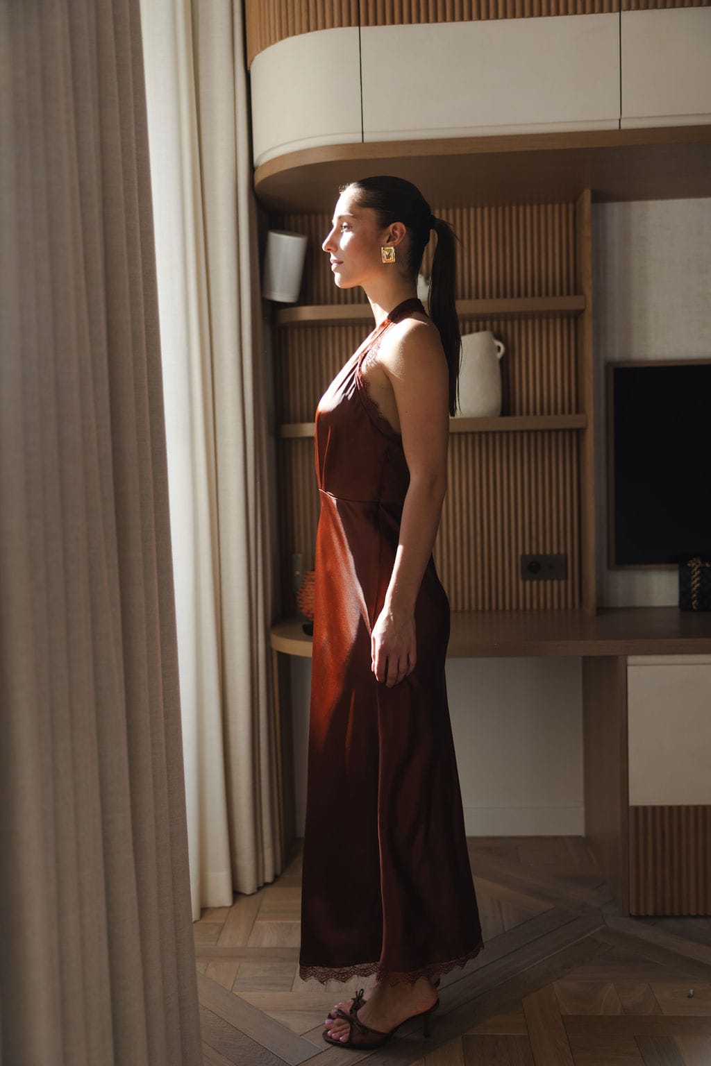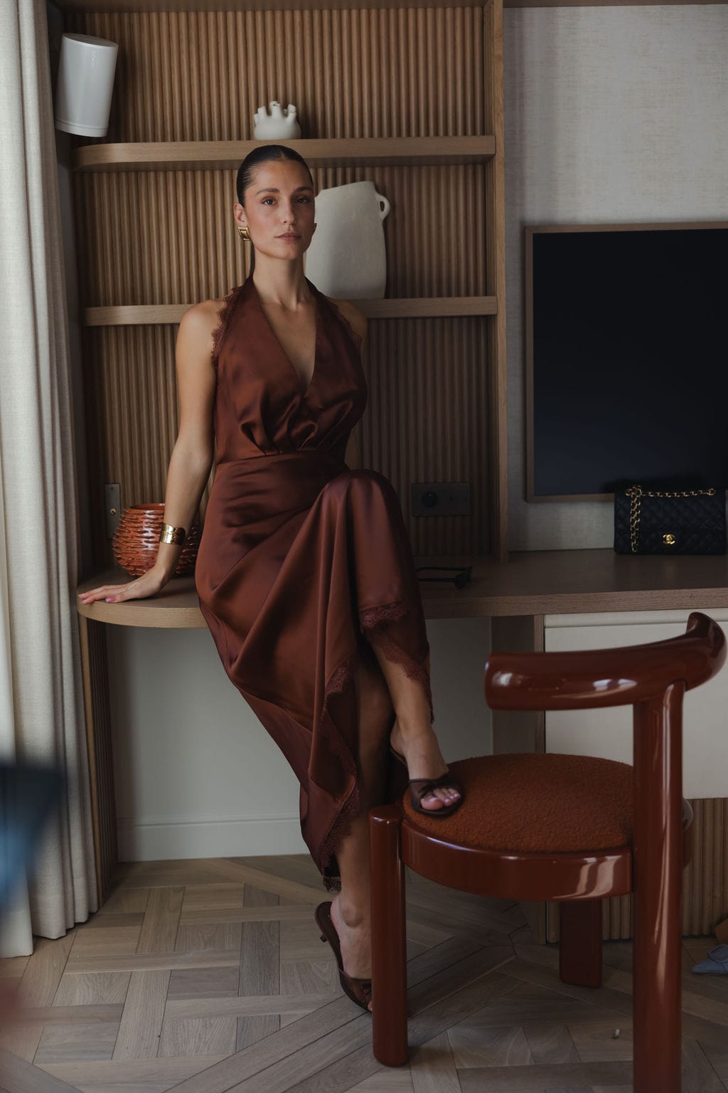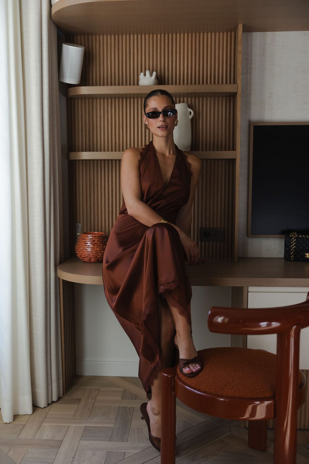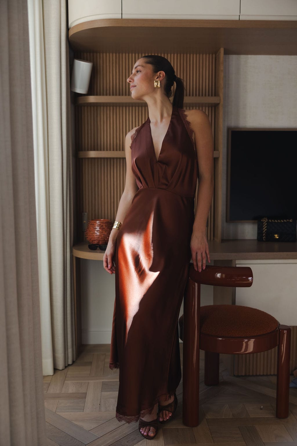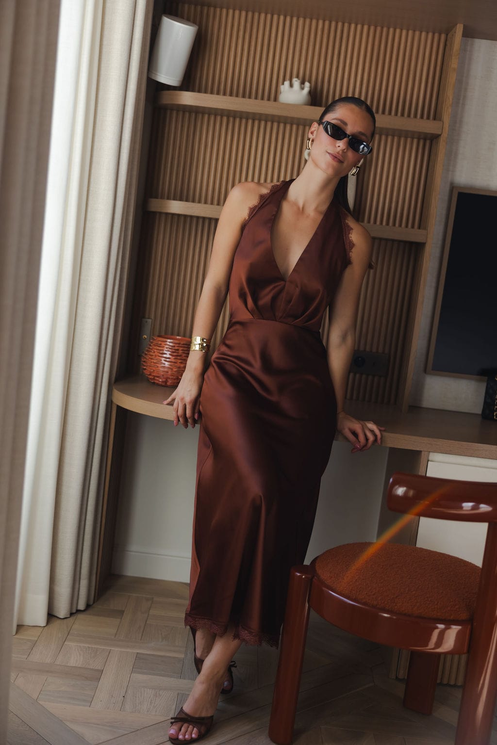 Sateen Kjole Cappuccino – Elegant satengkjole med halterneck