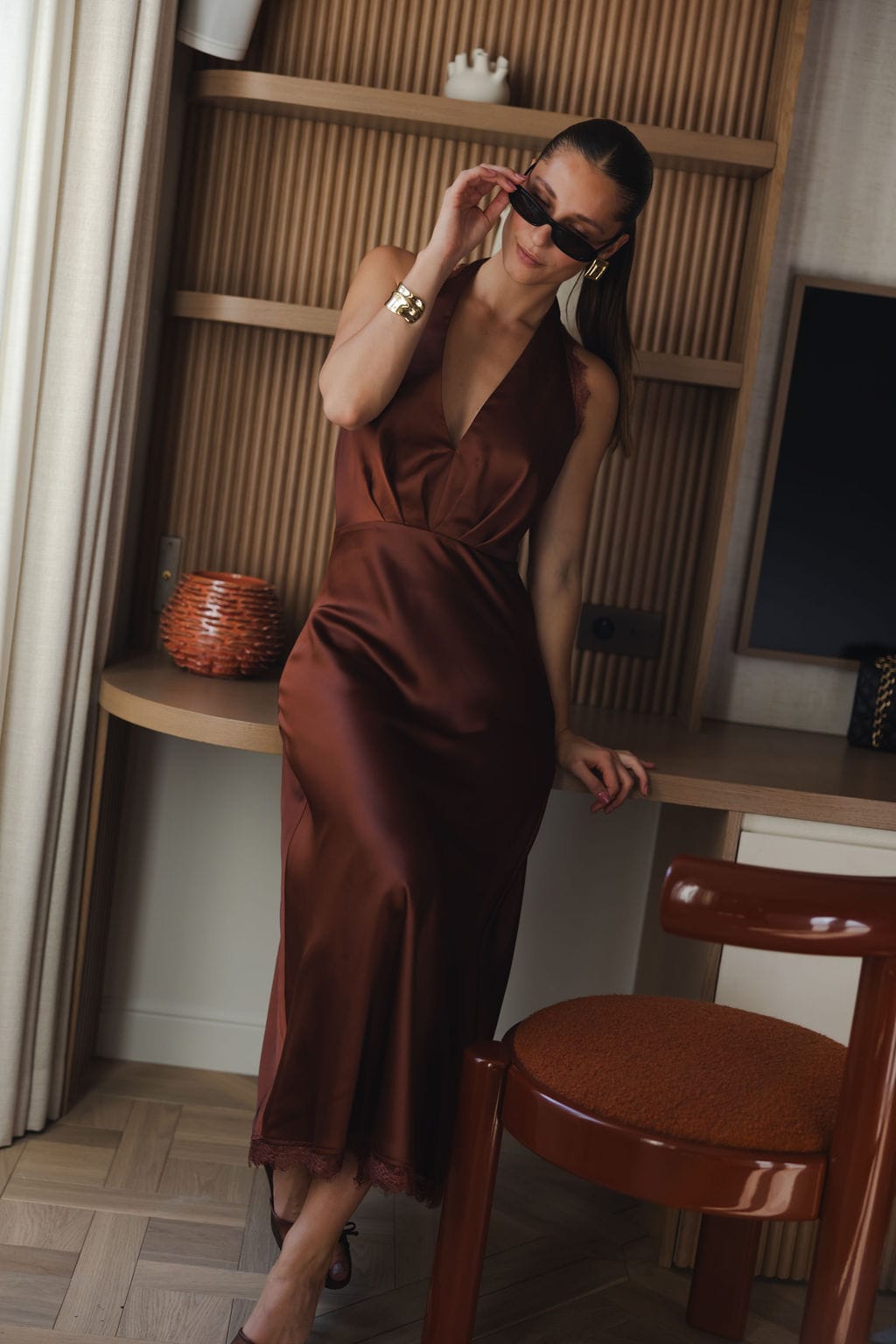 Sateen Kjole i cappuccino er en elegant og feminin festkjole i shiny sateng – perfekt til festsesongen. Den delikate halterneck-utformingen er dekorert med en fin blondekant, som også går igjen nederst på skjørtet og gir kjolen et eksklusivt uttrykk.