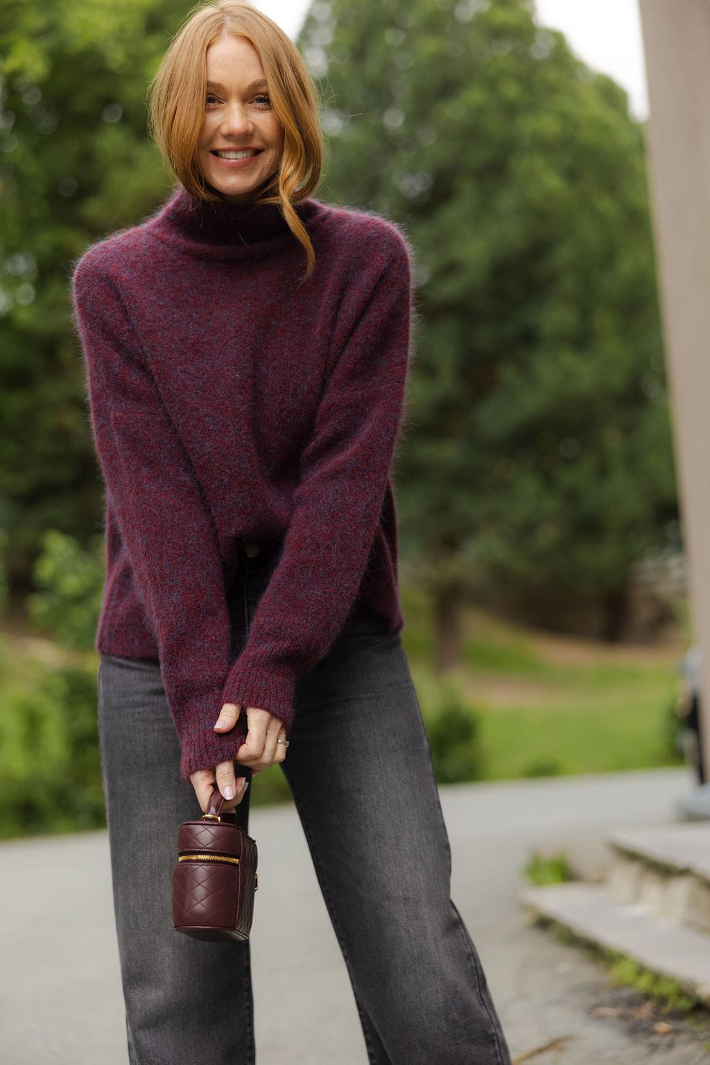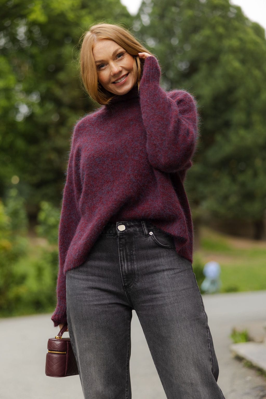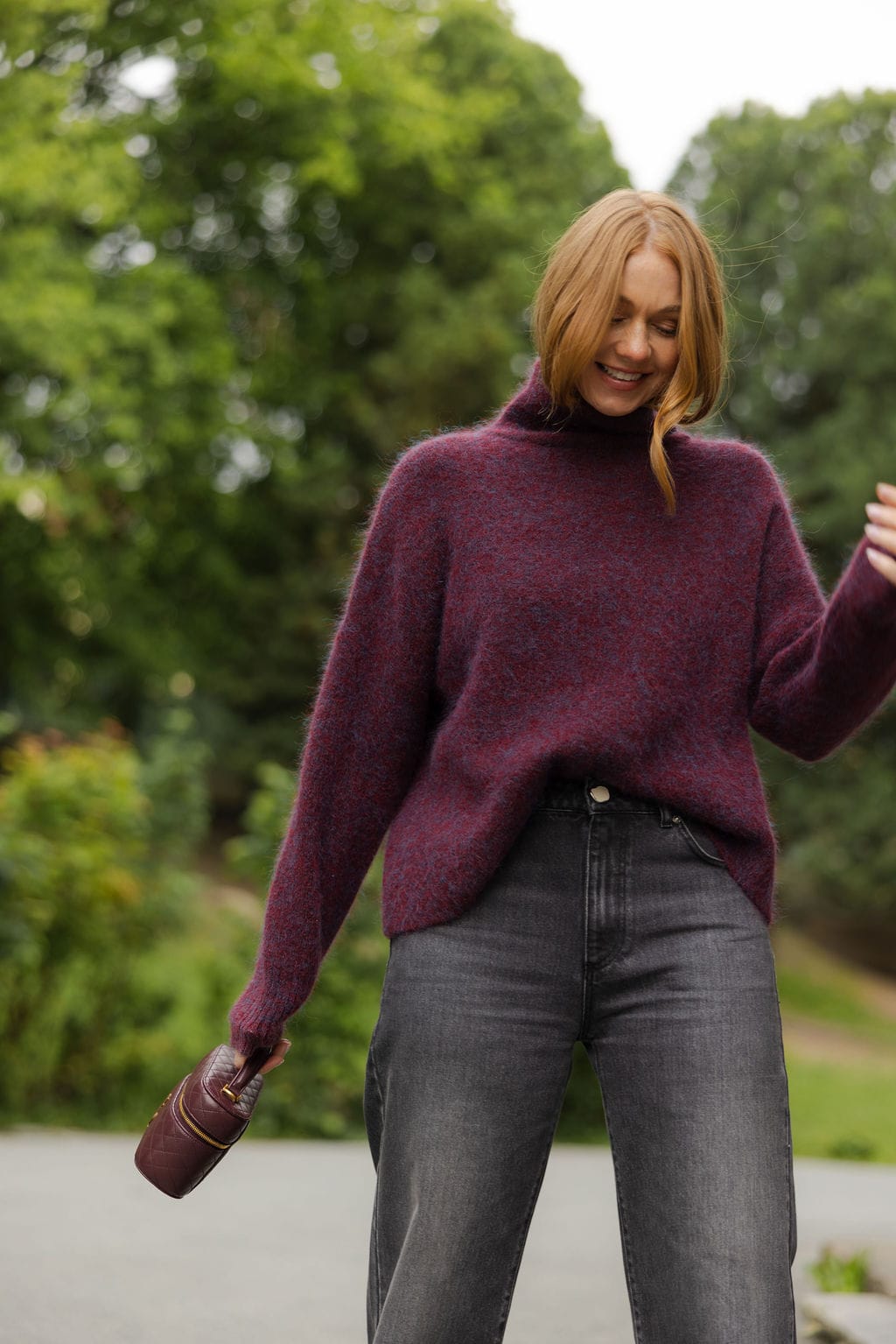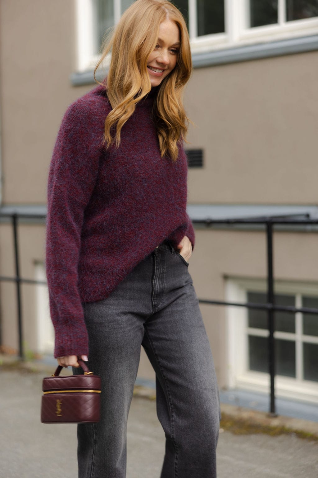 Denne burgunder ullgenseren er normal i størrelsen og laget i en luksuriøs blanding av mohair, ull og elastan, som gjør den myk, lun og behagelig mot huden. Et allsidig basisplagg som passer perfekt både til jeans og mer formelle antrekk.